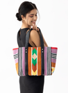 A perfect fashionable & colourful handbag to use every day. Your wallet, laptop, notebook, and everything else can be carried in it. It closes completely with a secure zipper closure. There are two interior pockets: a zippered pocket and a flat one with a leather trim. Comes lined with madras-checkered lungi fabric.