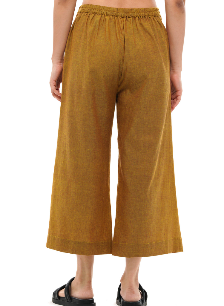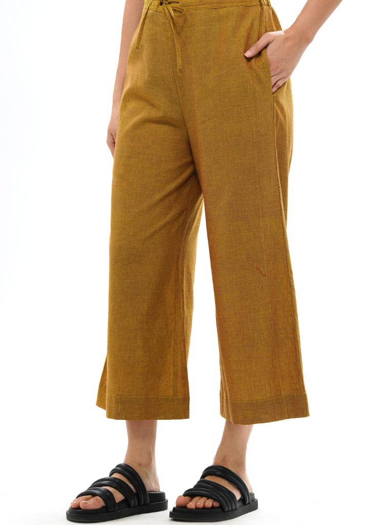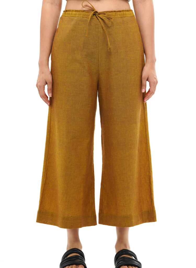 A pair of cropped palazzo with an adjustable drawstring and an elasticated back waist belt featuring side pockets. Made in 100% cotton. The model is 5'7" and wears a size S. This product is handwoven and handcrafted. Slight differences in the colour, texture and finish are to be cherished, not misunderstood.