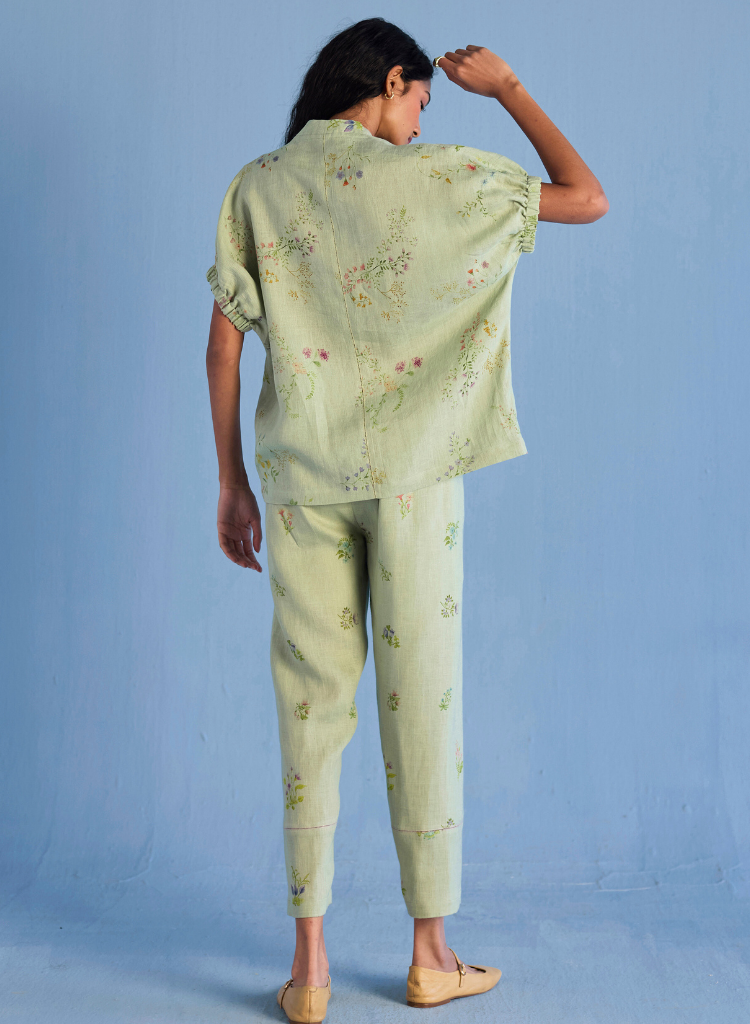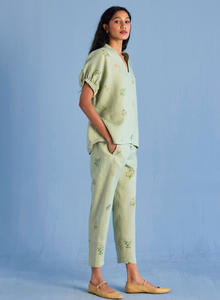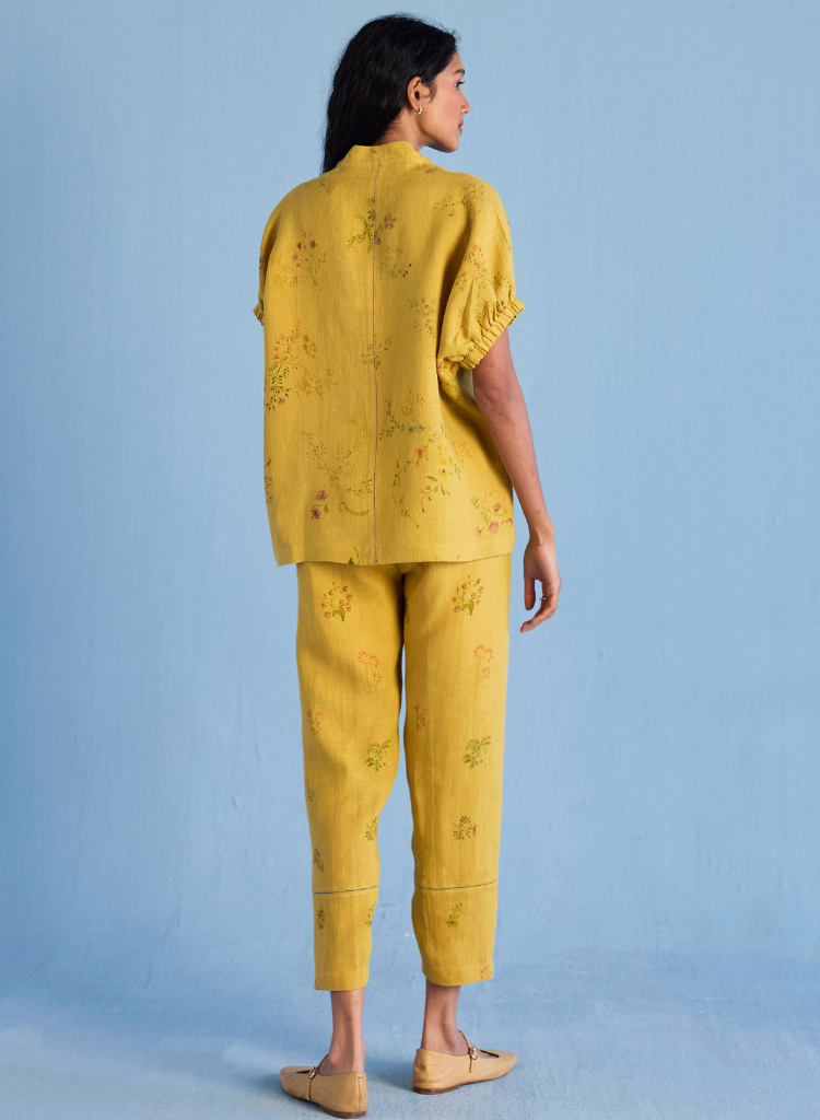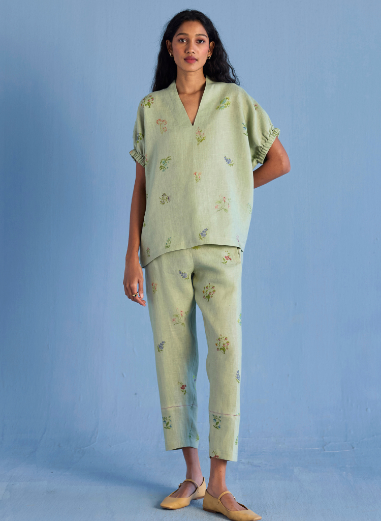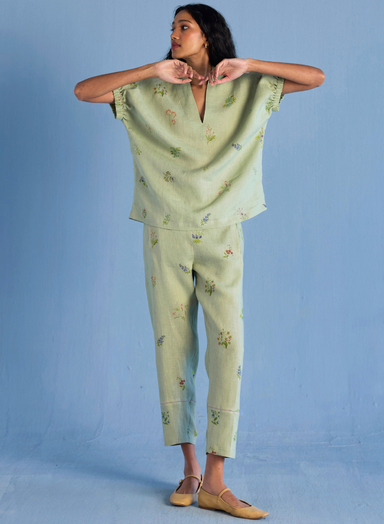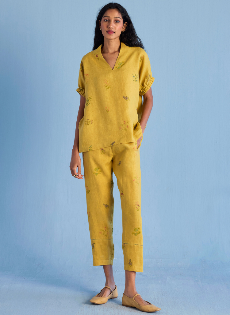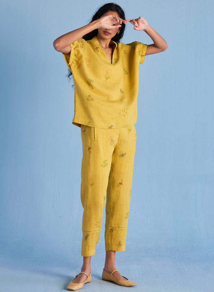 A two-piece set pairing the Mihen Elasticated Top and the Nama Floral Pants. The chic V- neck elasticated sleeve top with a hand- illustrated and hand-painted multicoloured floral print is enhanced with coloured fagotting stitch detailing the back. The tapered pants with a hand-painted multi-coloured floral print finished with a faggoting stitch in a pop-coloured thread features a drawstring, pockets and an elasticated back-waistband for a comfortable fit. Length 36". The model is 5'8" and is wearing a size S.
