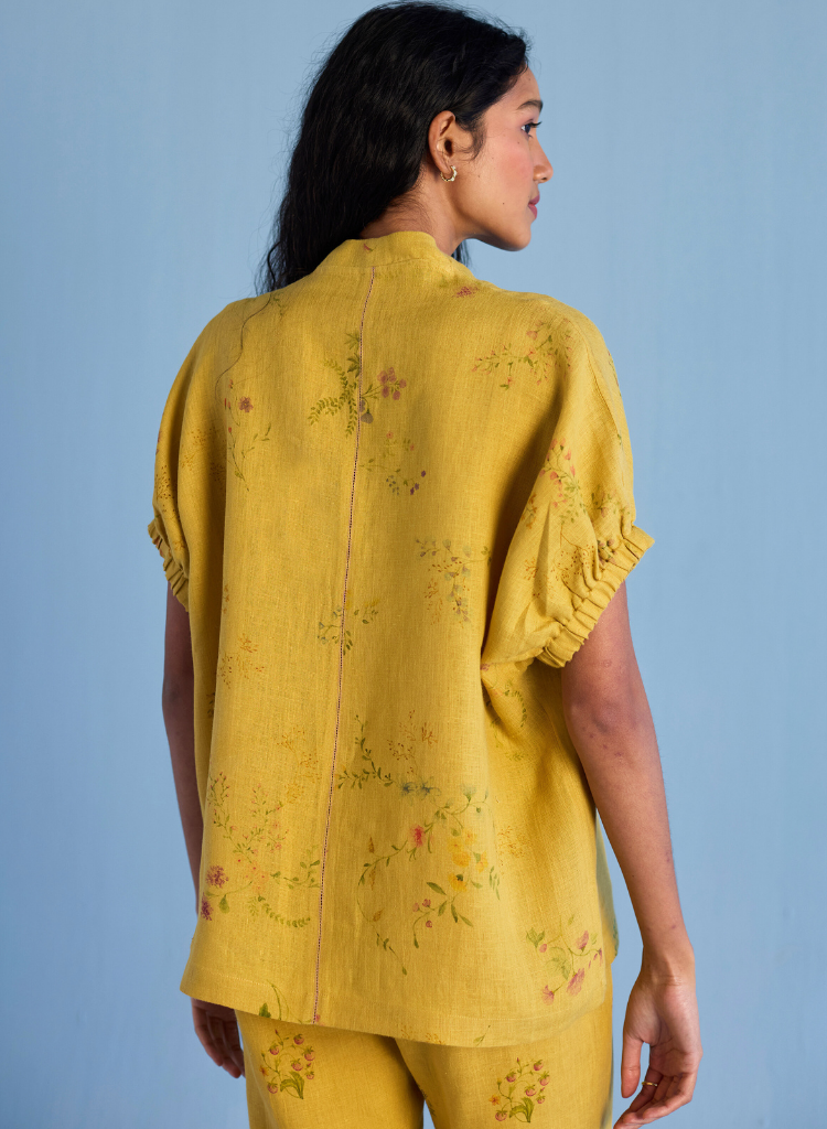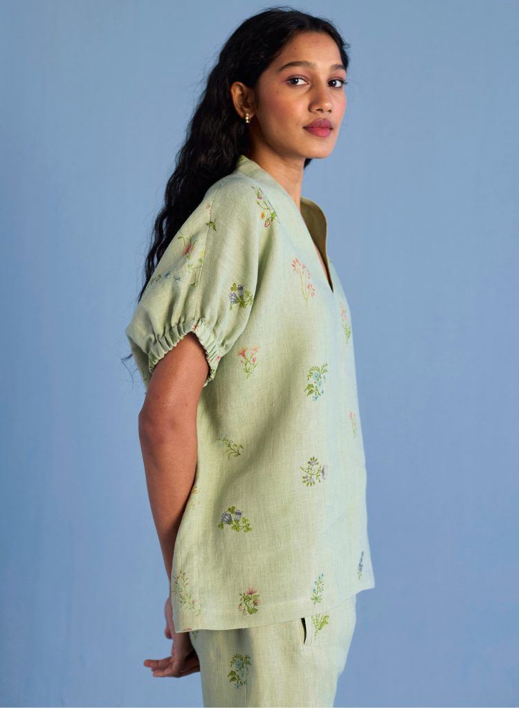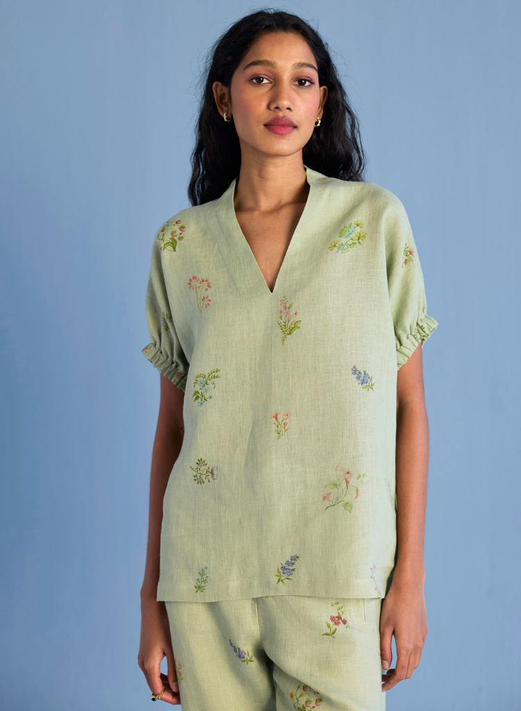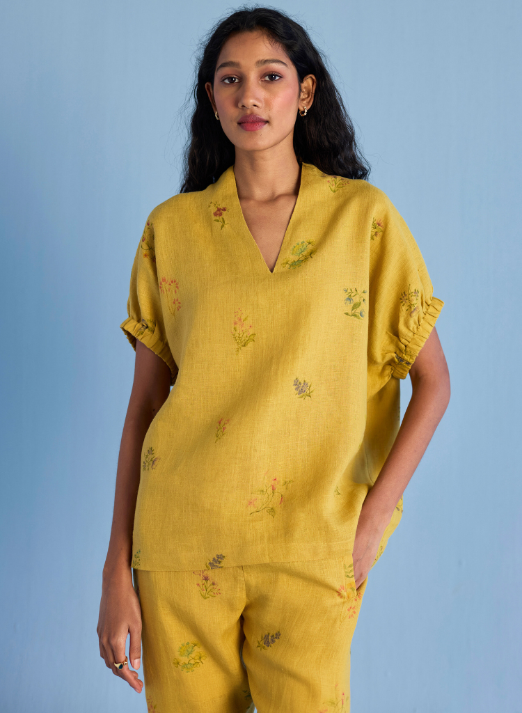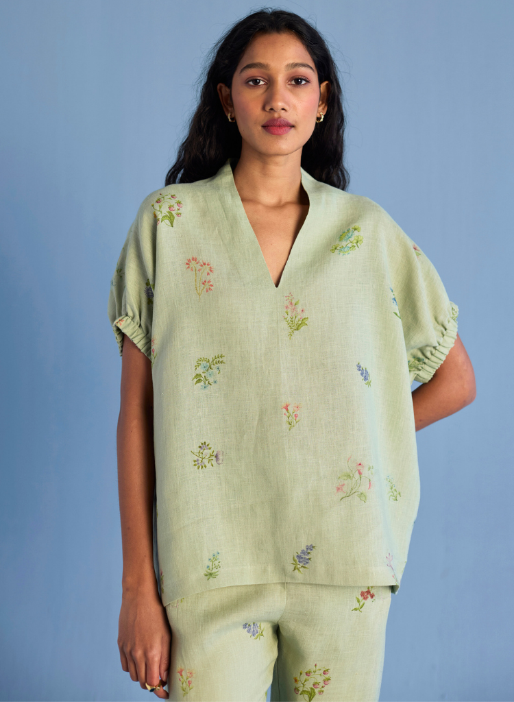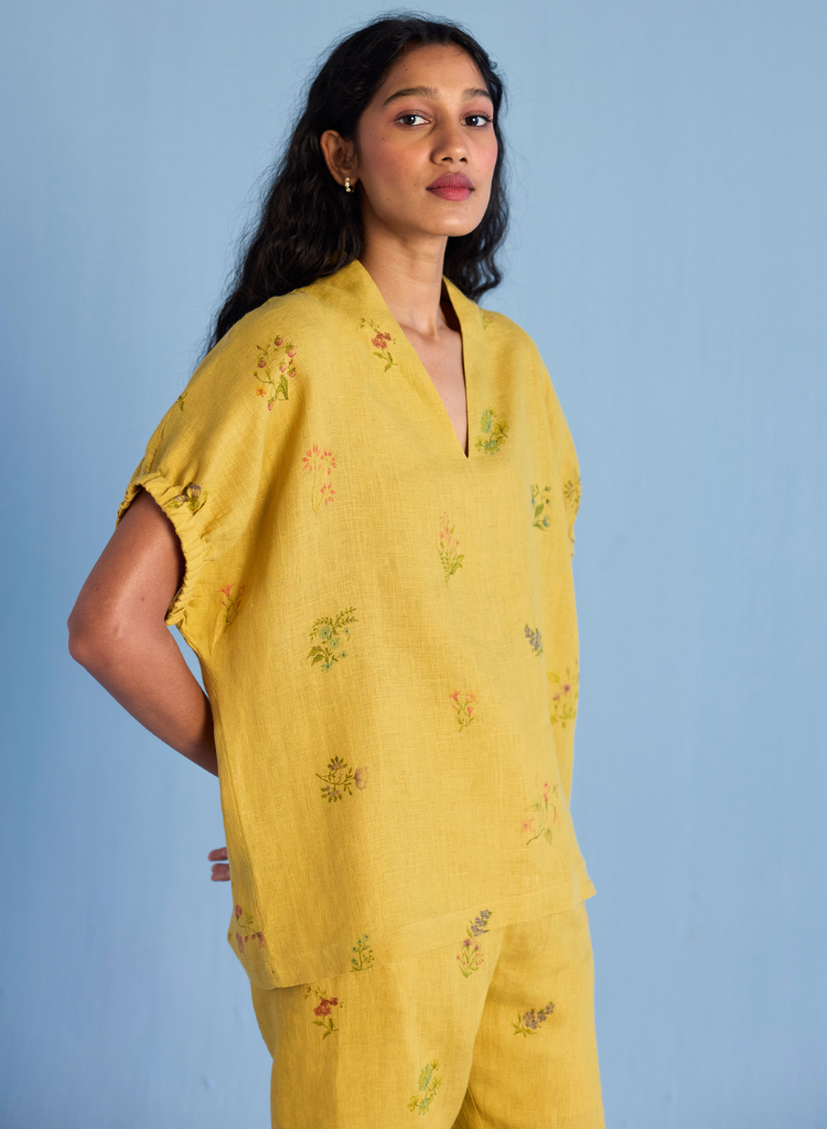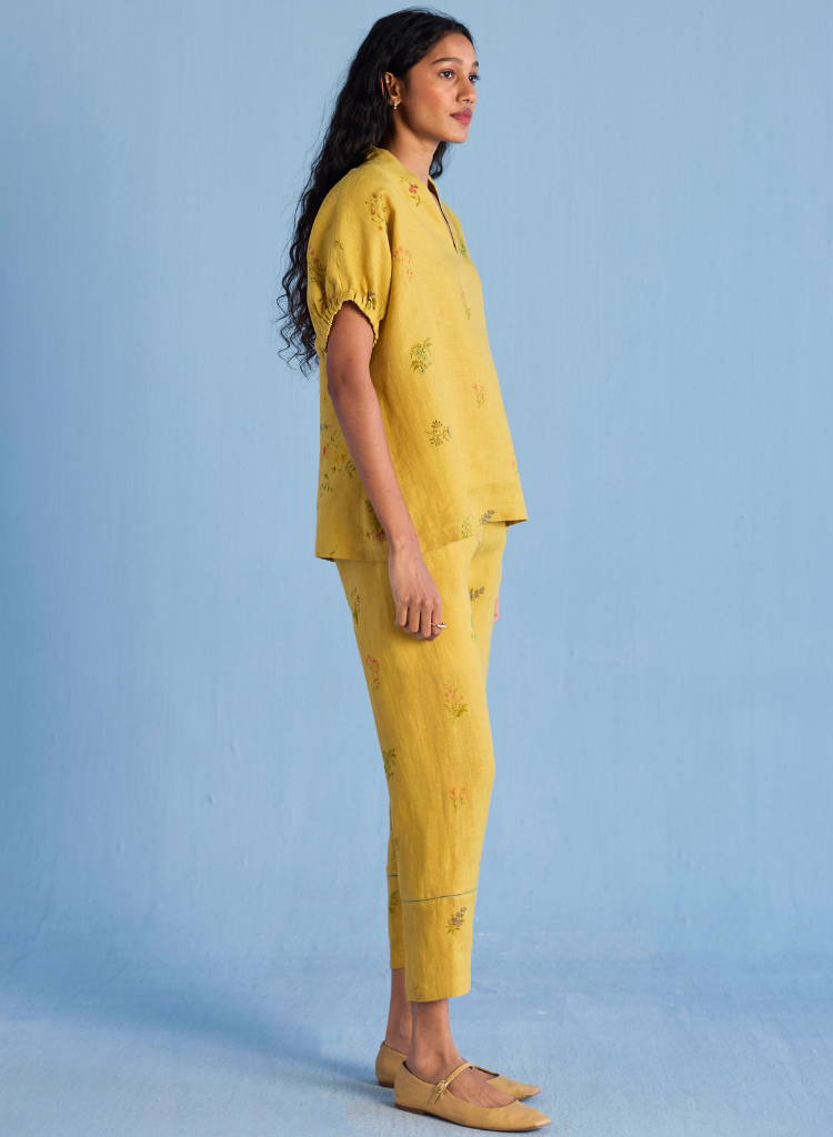 A two-piece set pairing the Mihen Elasticated Top and the Nama Floral Pants. The chic V- neck elasticated sleeve top with a hand- illustrated and hand-painted multicoloured floral print is enhanced with coloured fagotting stitch detailing the back. The tapered pants with a hand-painted multi-coloured floral print finished with a faggoting stitch in a pop-coloured thread features a drawstring, pockets and an elasticated back-waistband for a comfortable fit. Length 36". The model is 5'8" and is wearing a size S.