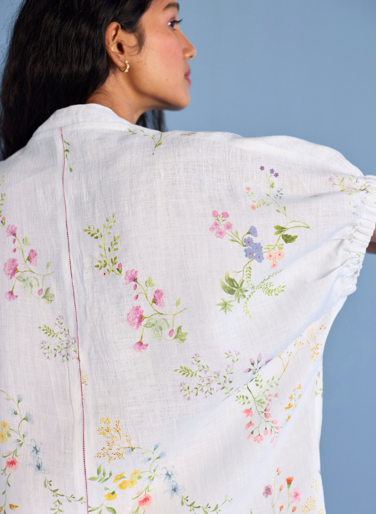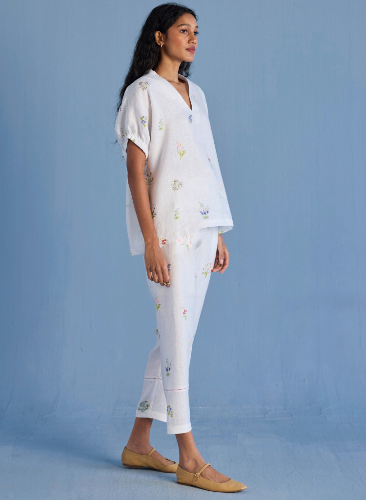A two-piece set pairing the Mihen Elasticated Top and the Nama Floral Pants. The chic V- neck elasticated sleeve top with a hand- illustrated and hand-painted multicoloured floral print is enhanced with coloured fagotting stitch detailing the back. Comes with a slip. The tapered pants with a hand-painted multi-coloured floral print finished with a faggoting stitch in a pop-coloured thread features a drawstring, pockets and an elasticated back-waistband for a comfortable fit. Length 36". The model is 5'8" and is wearing a size S.