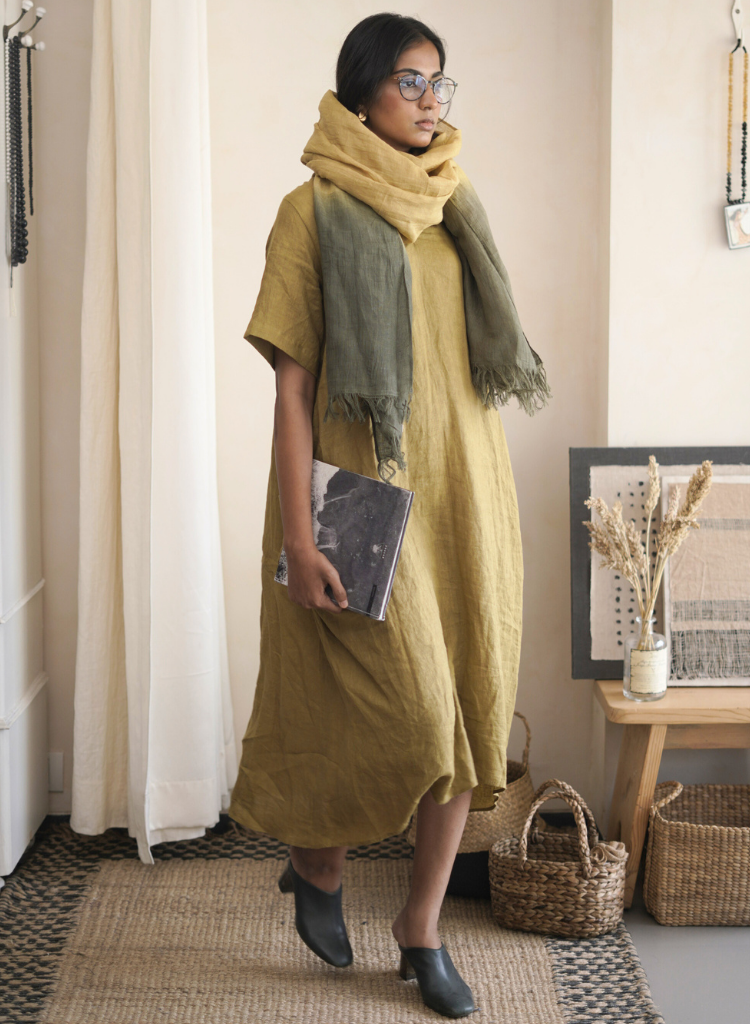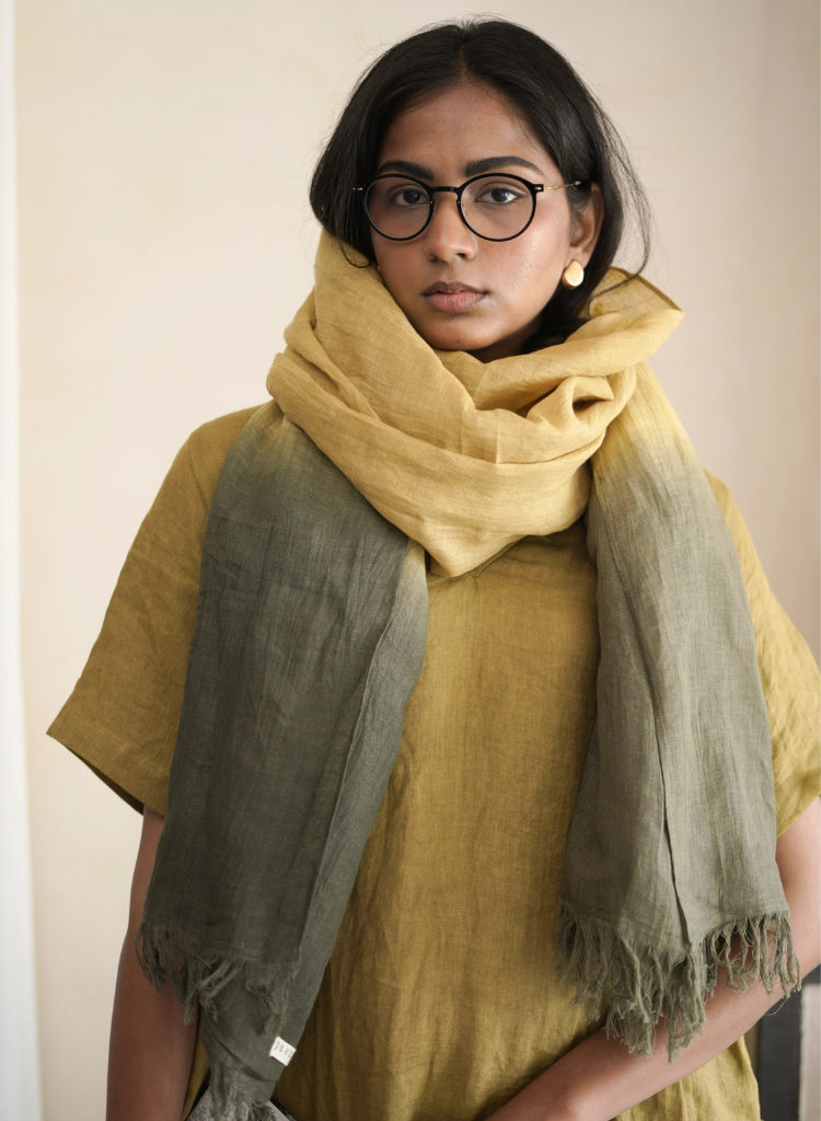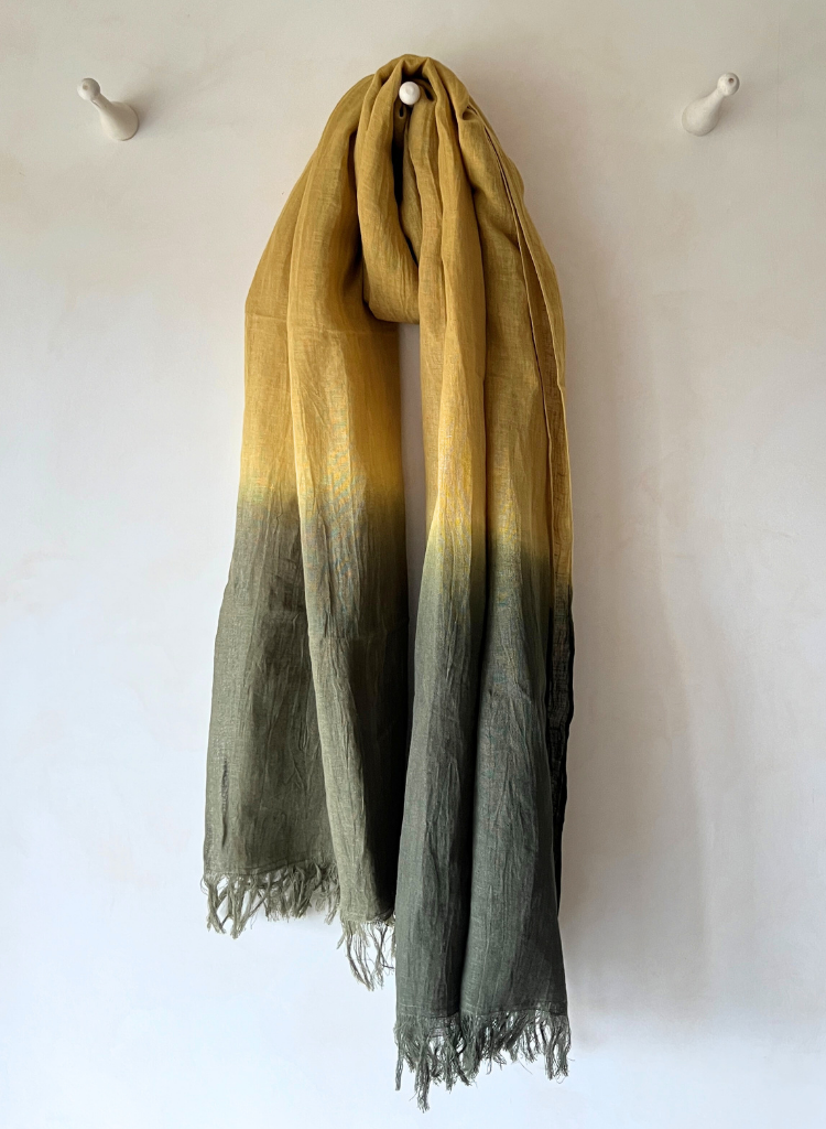 Soft, luxurious linen gradation with a breathtaking ombre effect, evoking sunset skies and gentle horizons. A wearable work of art, perfect for adding a touch of elegance to any outfit.