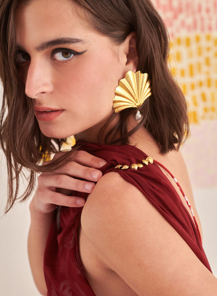 A long slip dress with an attached sheer drape, embellished at the shoulder. The organza drape elegantly cascades over the shoulders till back, giving a modern Indian look. Features a back tie and a back zip enclosure. Length 55”. The model is 5'7" and is wearing a size S.