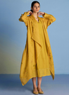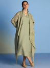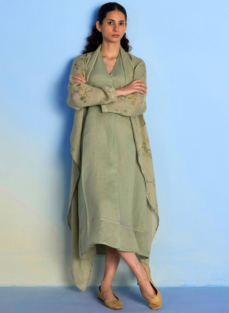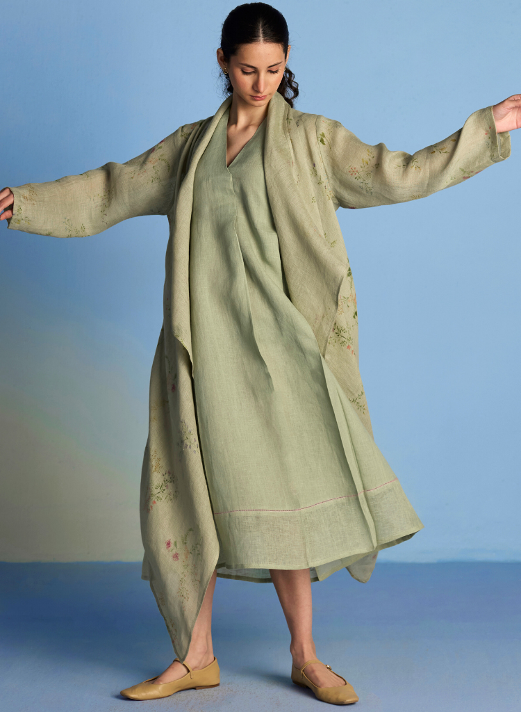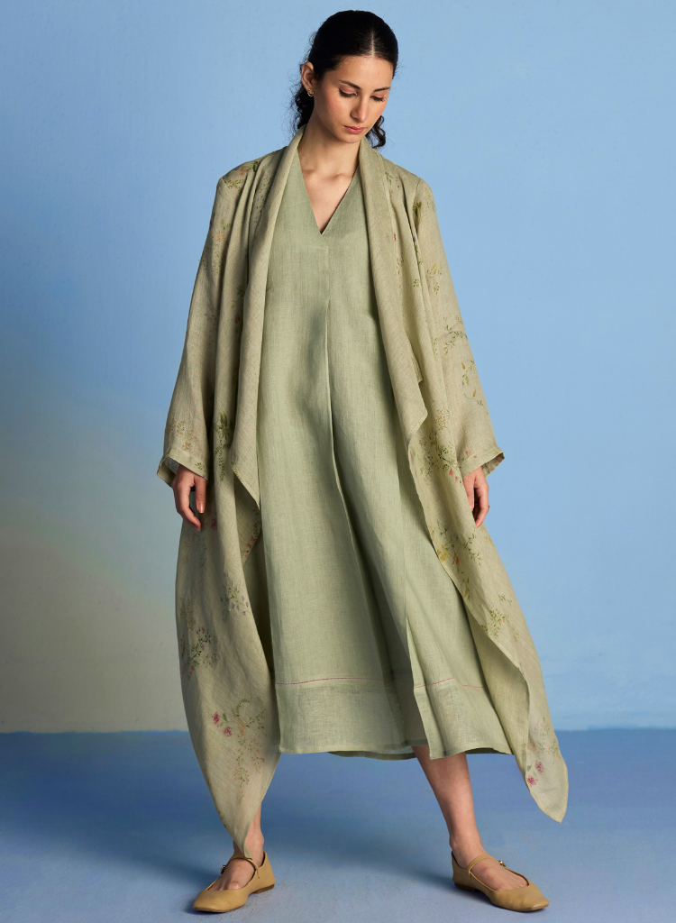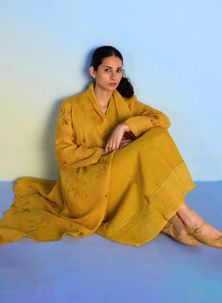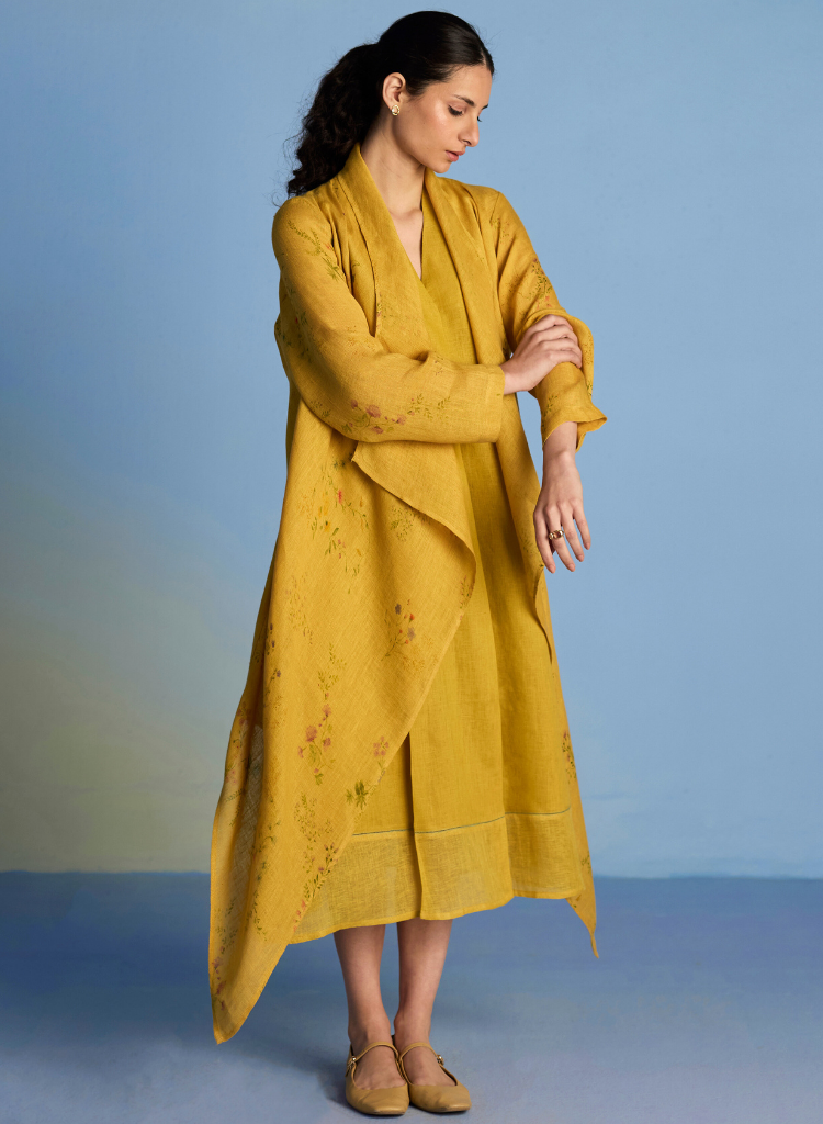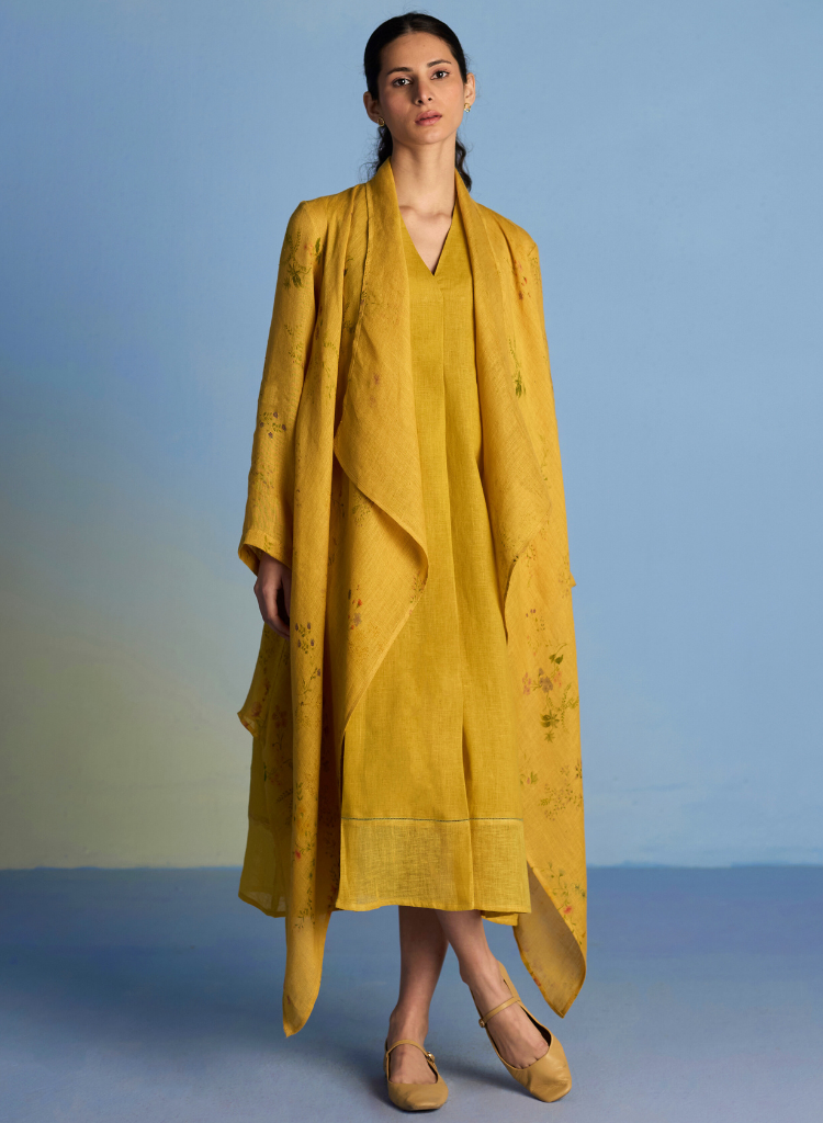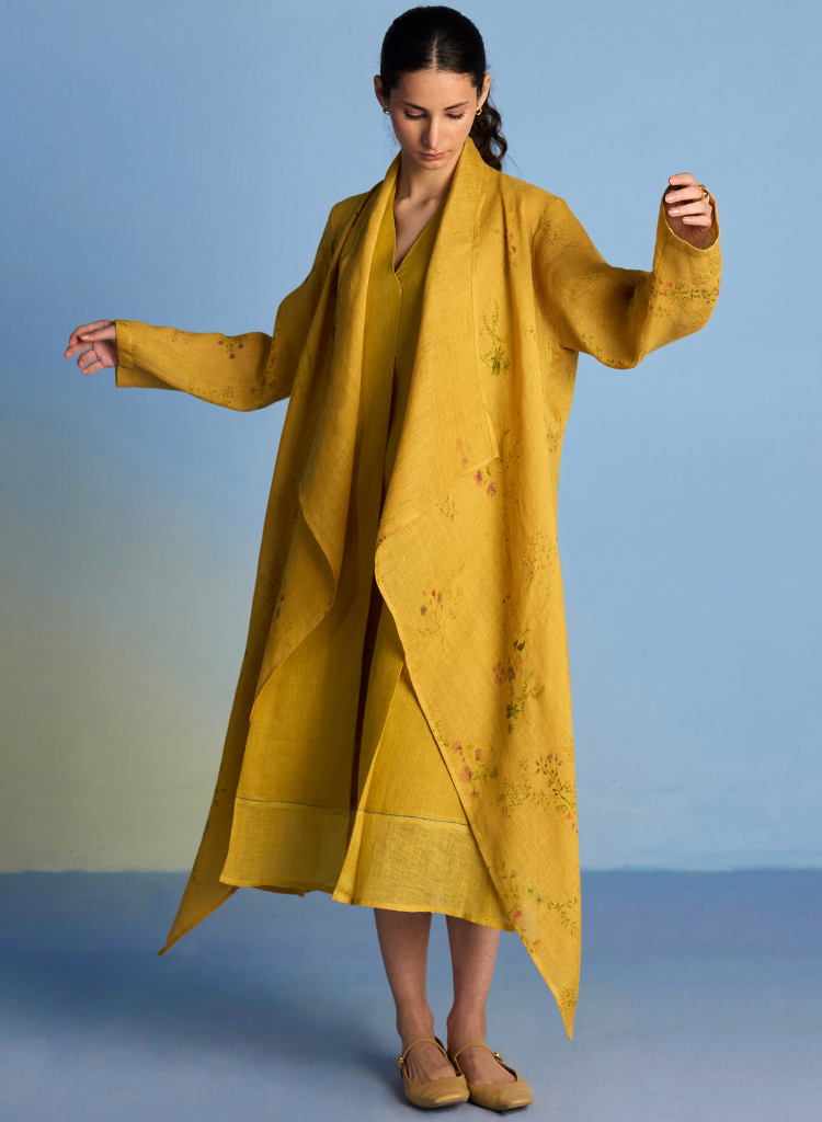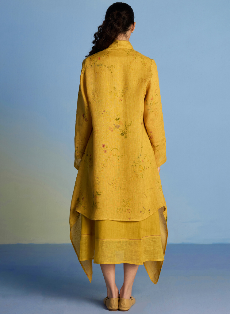 A soft flowing waterfall hem overlay handcrafted from soft sheer linen printed with a multi-coloured floral pattern. The model is 5'7" and is wearing XS-S.