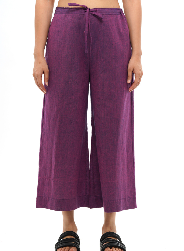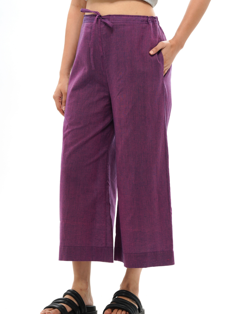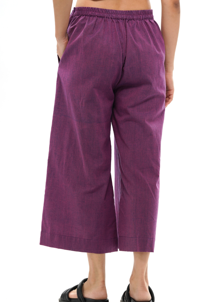 A pair of cropped palazzo with an adjustable drawstring and an elasticated back waist belt featuring side pockets. Made in 100% cotton. The model is 5'7" and wears a size S. This product is handwoven and handcrafted. Slight differences in the colour, texture and finish are to be cherished, not misunderstood.