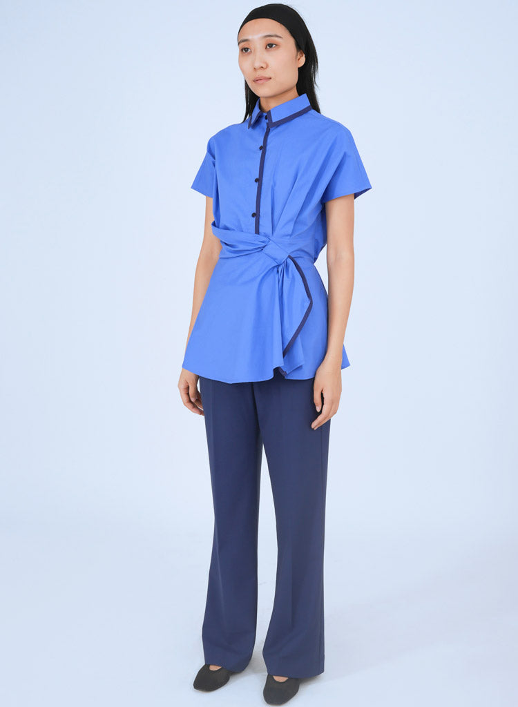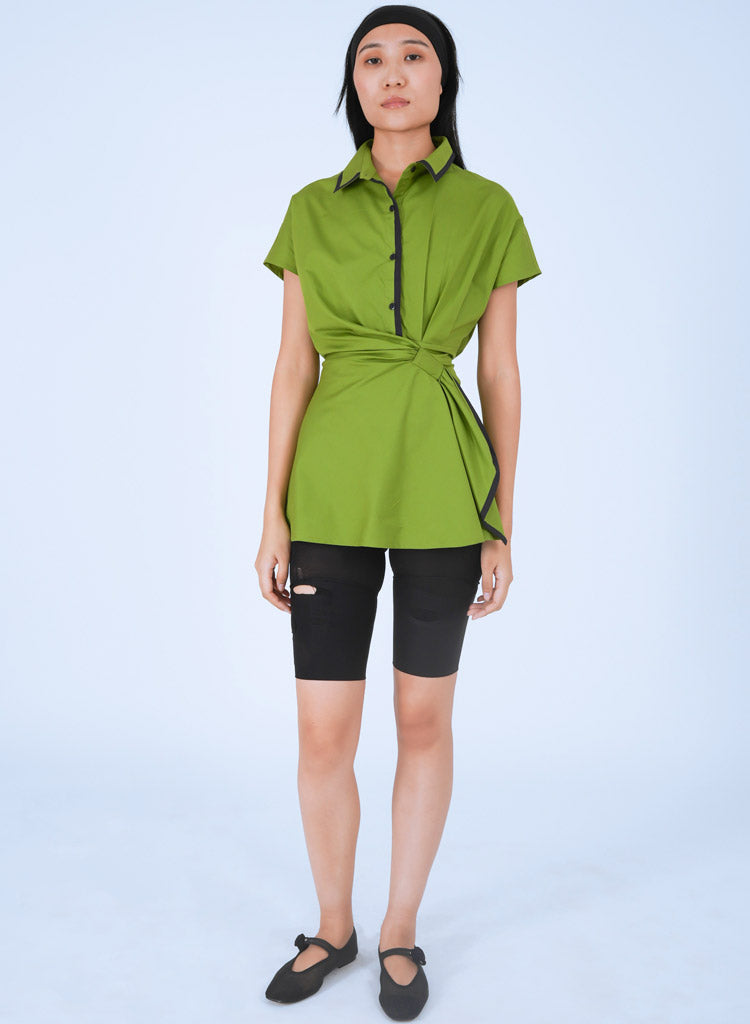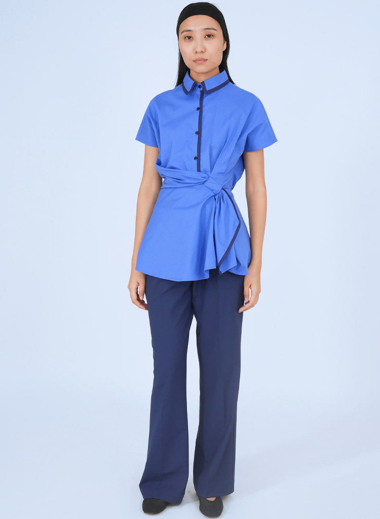 An asymmetrical draped top with contrast piping details featuring a shirt collar and a half button placket. Length 28". The model is 5'10", and is wearing size M.