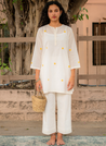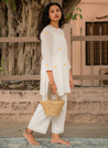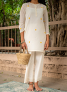 A two-piece set pairing the Zuri Kameez and solid pants. The relaxed fitting tunic with hand embroidered details features a round neck with button opening and side slits. Length 32". Comes with a slip. The ankle length pants feature an elasticated waist and inseam pockets. Length 38". Comes with a lining. The model is 5'8" and is wearing size S.