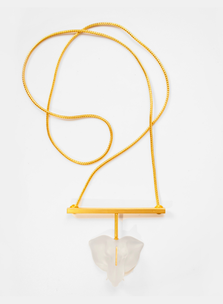 This timeless necklace features the striking elephant motif, conscientiously crafted, taking center stage on a sleek gold bar pendant. Suspended on a chain, this statement piece effortlessly blends modern aesthetics with nature's grace. A symbol of wisdom and strength, this necklace is a perfect addition to your festive or special occasion attire.