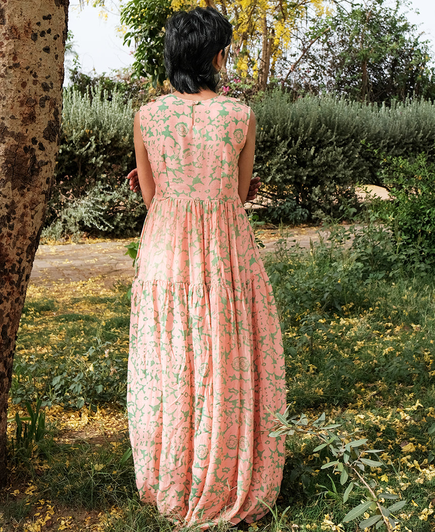 A long-tiered dress with a floral hand block print. Features a peter pan collar, gathered tiers and an eyelet opening in the back. Length 55”. The model is 5'6" and is wearing a size S. Fully lined.