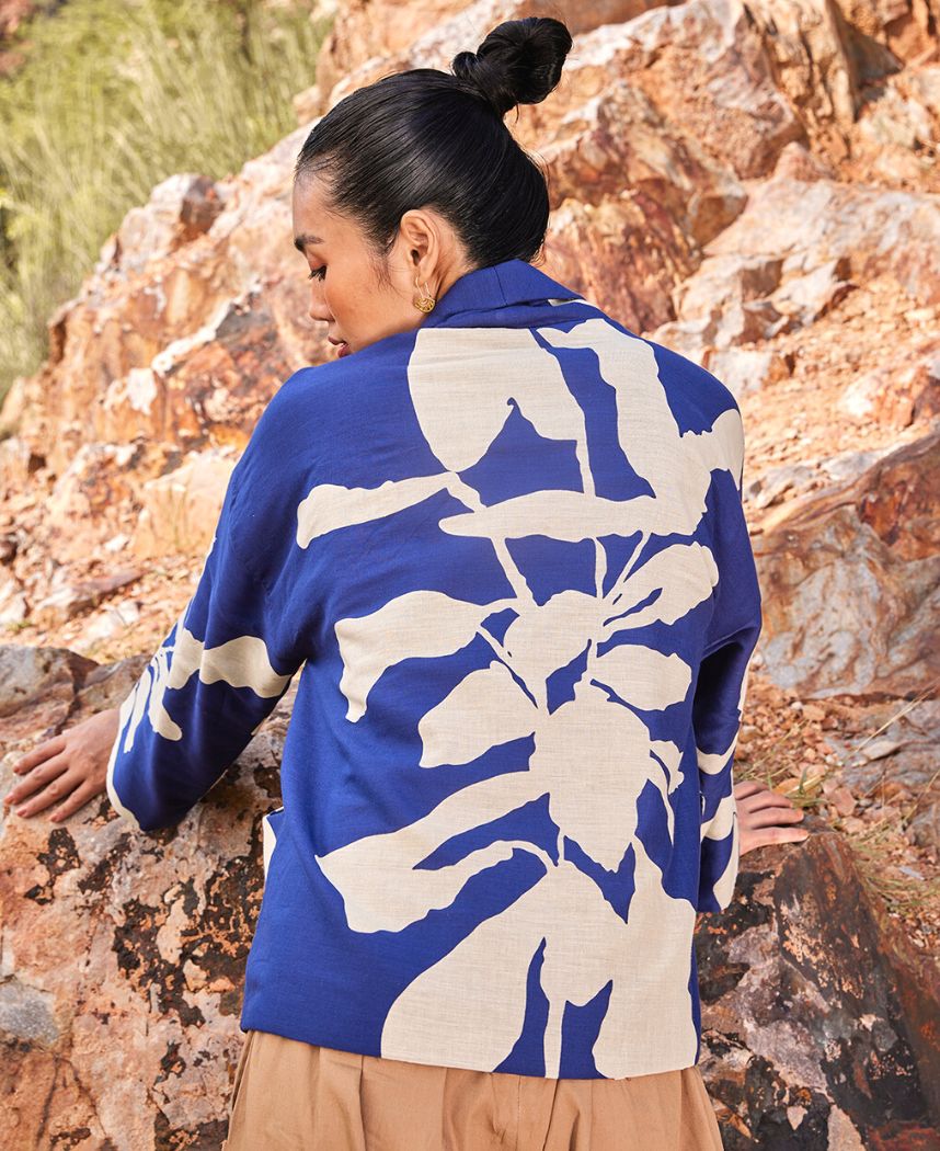 A kimono style reversible jacket with a floral print featuring a shawl collar and front pockets. Length 24.5". The model is 5'8" and is wearing size S.