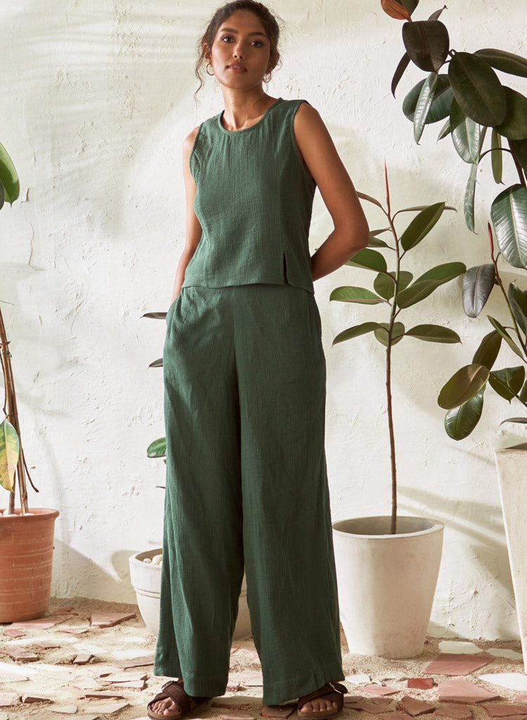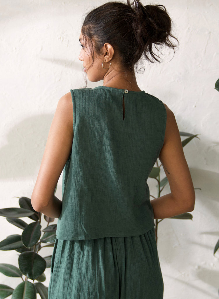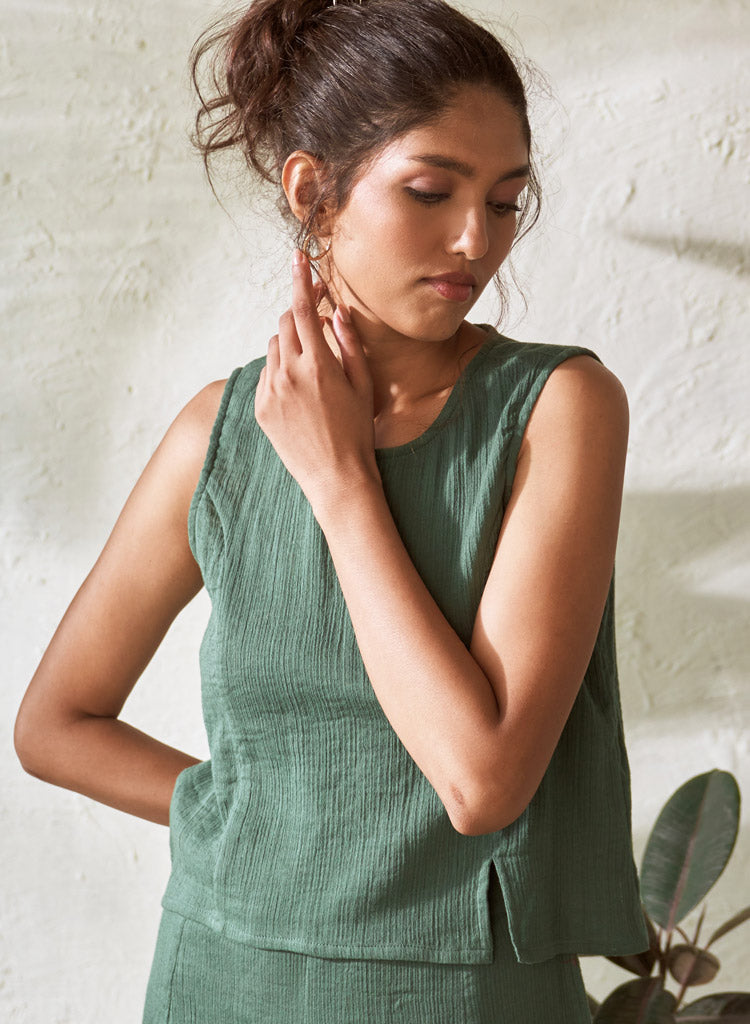 An A-line crop top with a side slit featuring a round neck. Length 19". The model is 5'8" and is wearing size S.