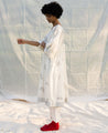 A pleated tunic dress with hand block printed flowers and statement sleeves. Features a V-neck, inseam pockets and contrast lining at the bodice and hem. Length 42". Made in 100% cotton, fully lined.