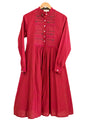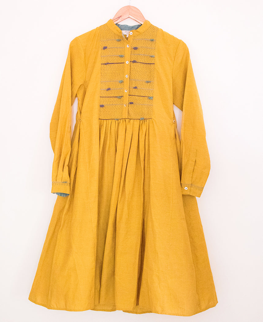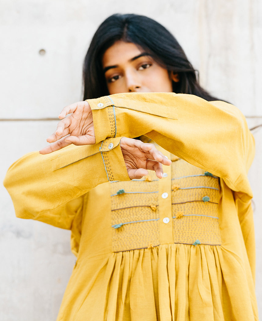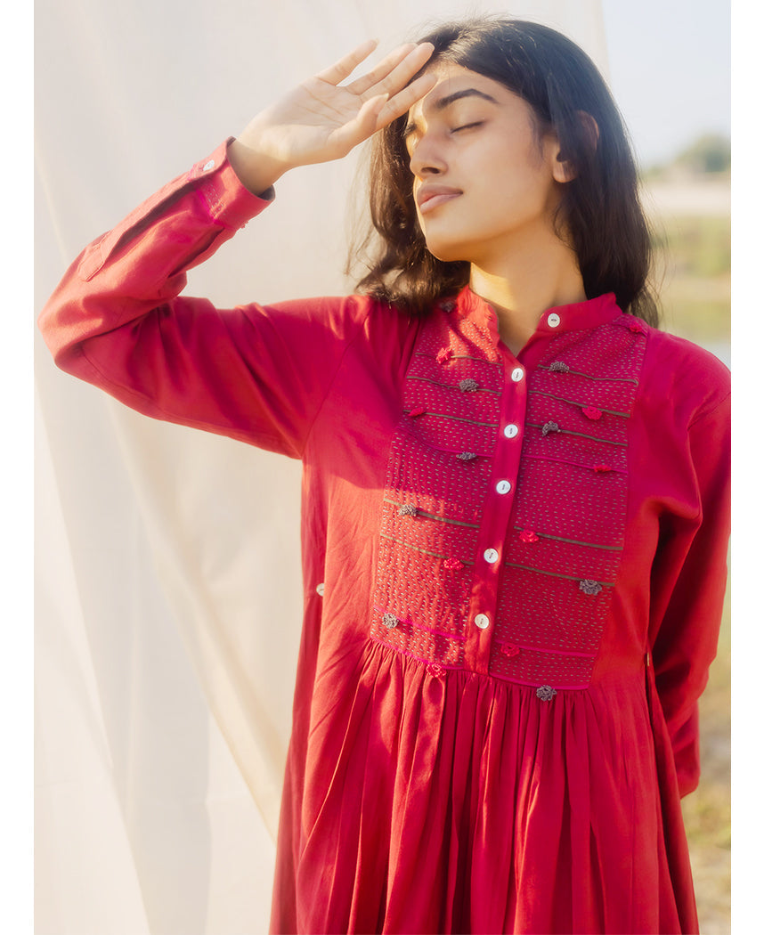 An A-line dress with hand embroidery and hand crochet details on the yoke. Features a gathered yoke, front button and side buttons at the waist for a better fit. Length 40". The model is 5'5" and is wearing size S.