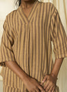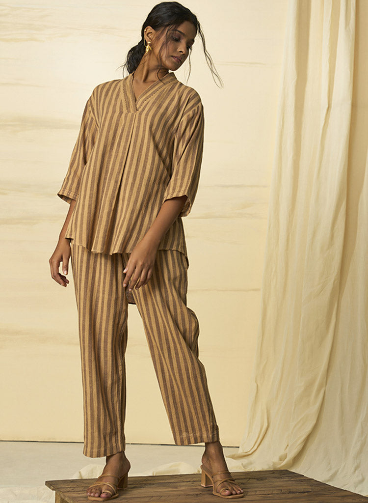 A two-piece set pairing the Desert V Neck Top and the Desert Pyjama Pants. The kurta top with delicate hand embroidery details features a flattering V neck and a box pleat detail and 3/4th sleeves. Length 27". The striped high waisted pants feature an elasticated waist and inseam pockets. Length 37". The model is 5'6" and is wearing a size S.