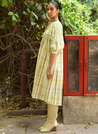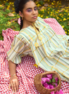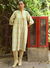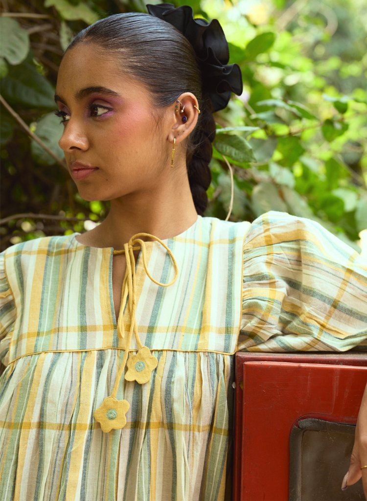 A relaxed fitting striped midi dress featuring a round neck with flower-shaped tassels and 3/4th sleeves. Length 46". The model is 5'9" and is wearing a size S.
