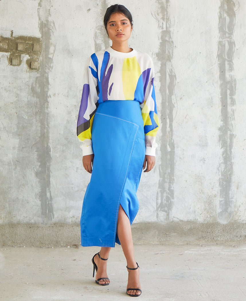 A sweatshirt style top with a vibrant abstract print. Features a ribbed neck and cuffs. Length 23". The model is 5'5" and is wearing size S.