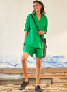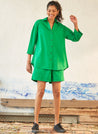 A two-piece set pairing the Green Peppers Shirt and a matching shorts. The flowy oversized shirt features a V-neck, a curved hemline, and elegant shell buttons. Length 28". The matching shorts feature a half-elastic waistband and convenient flap pockets. Length 16". The model is 5'9" and is wearing size S.