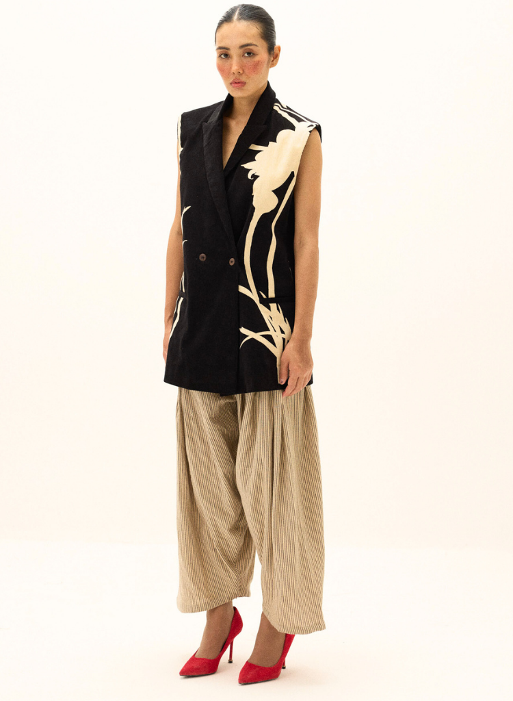 A two-piece set pairing the Haze Blazer and the Twine Pants. The structured sleeveless blazer features an abstract print tailored with front buttons and long length for a contemporary edge. Length 30.5". Made in cotton corduroy. The relaxed fitting wide-leg pants feature a draped silhouette and pleated detailing. Length 33". Made in handwoven cotton.