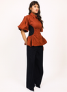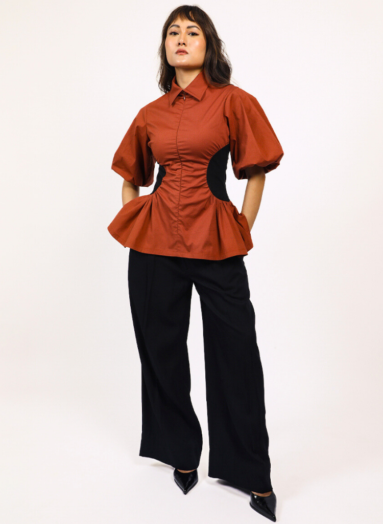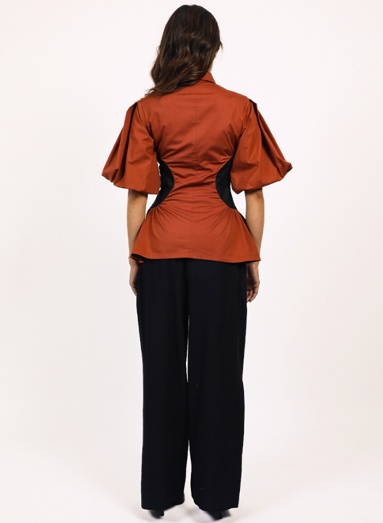 A top with a cinched waist and a contrast side panel, a flared hem and pleated puff sleeves featuring a pointed collar and a concealed frontal zip closure. Length 27". The model is 5'8" and is wearing size S.