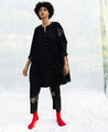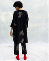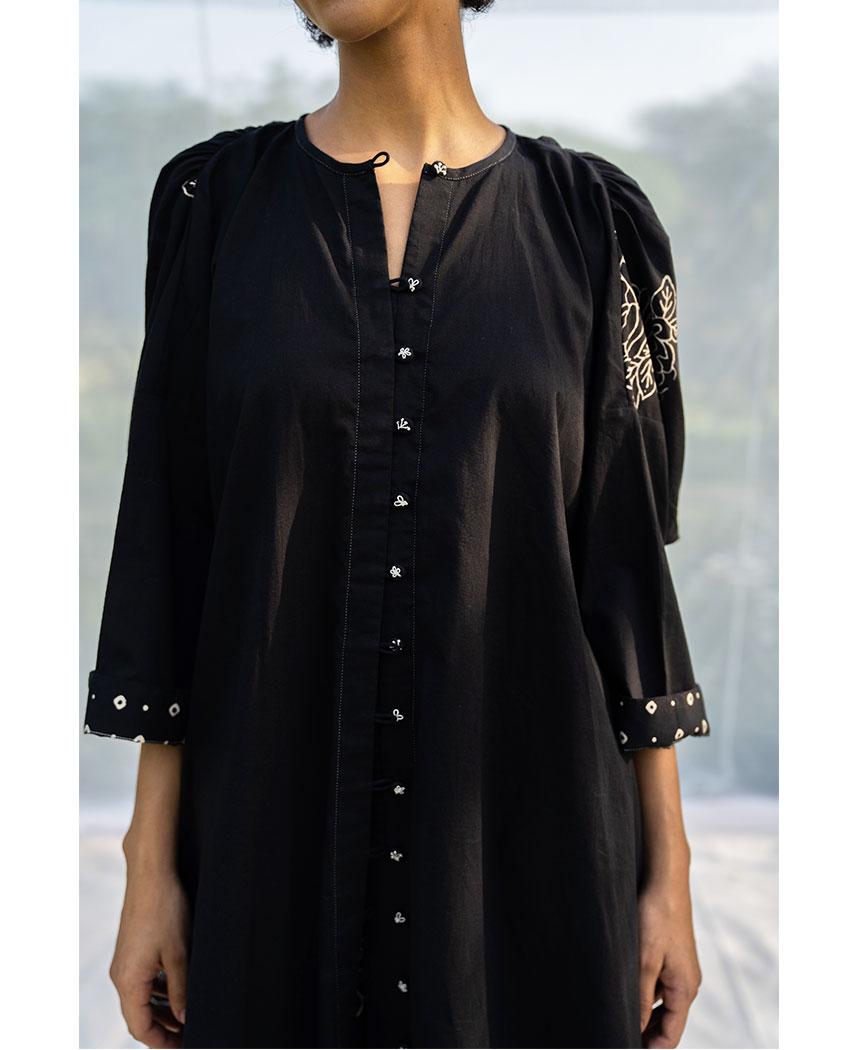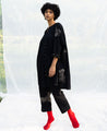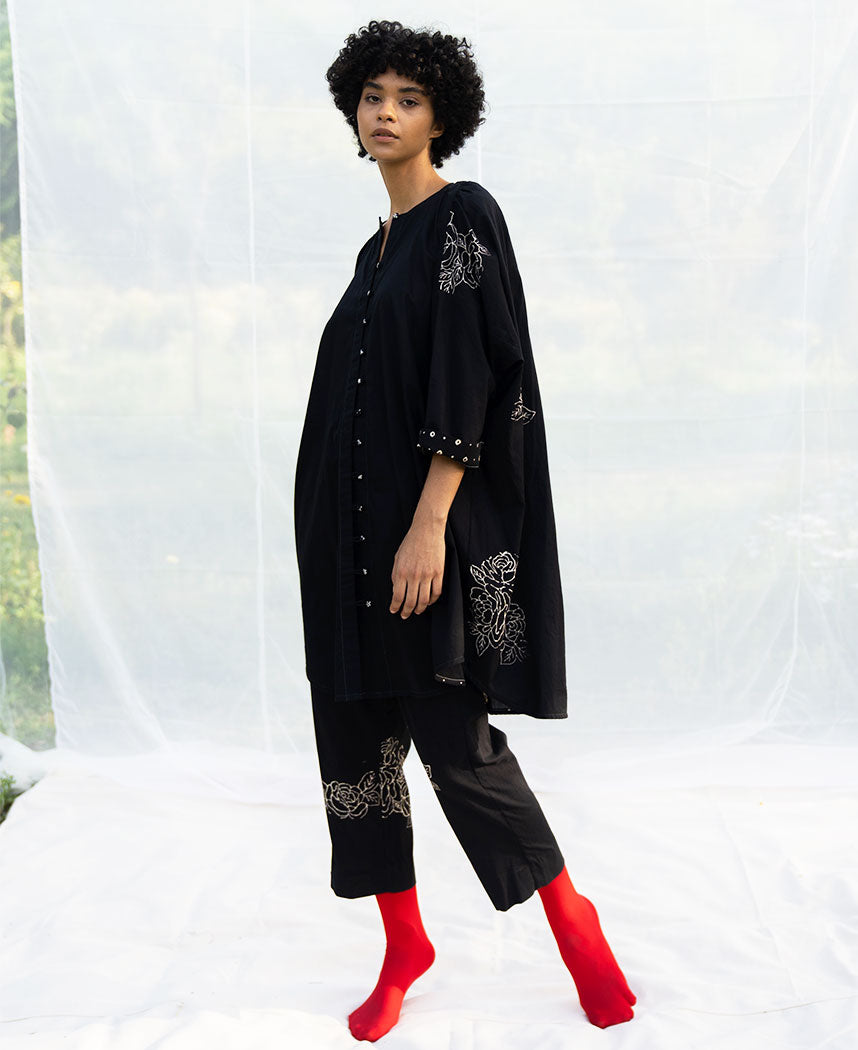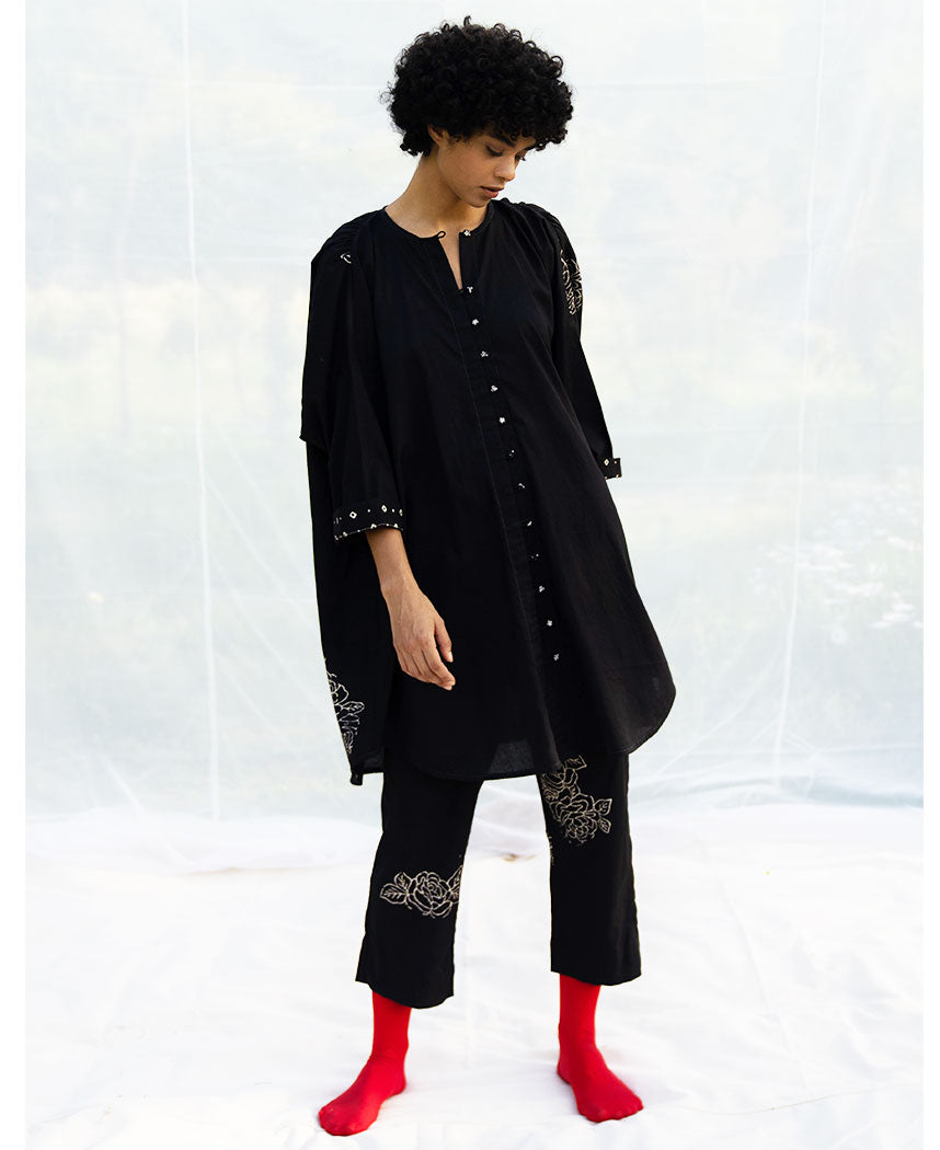 An oversized tunic with kimono sleeves and hand block printed flowers. Features a front placket with hand embroidered buttons, contrast cuffs and a closed round neck. Length 38". Made in 100% cotton.