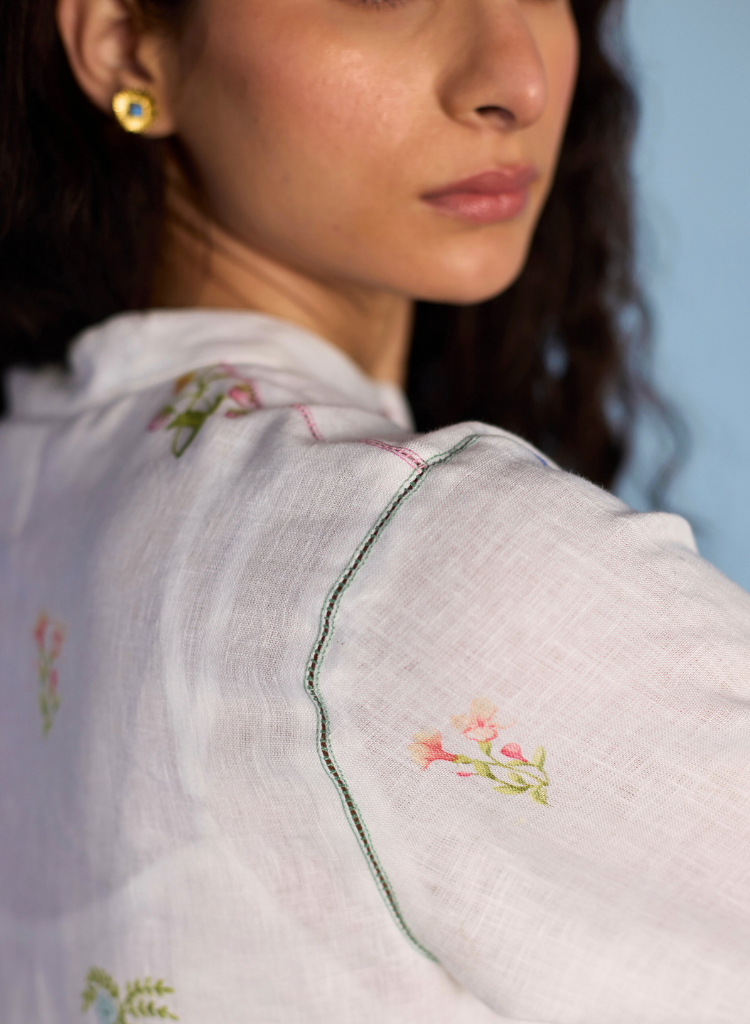 A two-piece set pairing the Leina A-line Shirt and the Mapa Culottes. The statement A-line shirt with two hand-illustrated delicate multi-colour floral prints - a Jaal print and a Buta (motif) print features unique mixed material buttons including linen fabric buttons and a crochet button, colourful thread buttonholes and faggoting stitch detailing. Comes with a slip. The timeless culottes with a sheer linen patchwork band at the hemline with a tonal faggoting stitch detail features pleats at the waistband, comfortable pockets and a soft elasticated back waistband. Length 37". The model is 5'7" and is wearing a size S.
