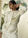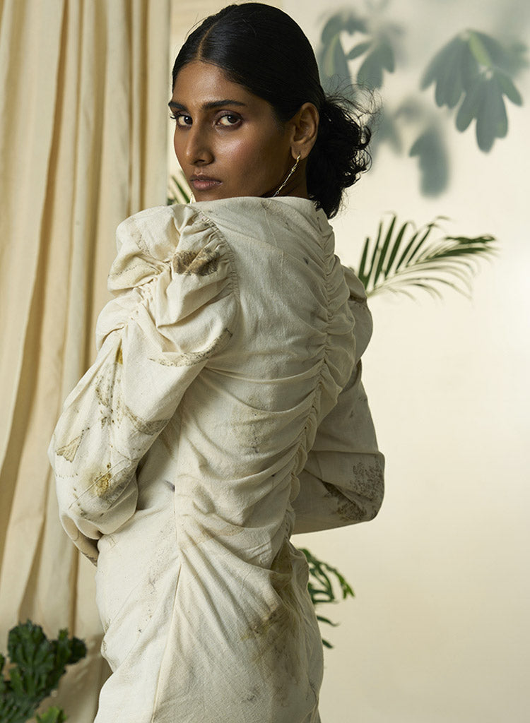 Wash separately in cold water. Use pH neutral washing soap. Do not wring. Do not tumble dry. Do not use hot iron. Do not dry in direct sunlight. Dry flat in shade. Store naturally dyed garments in a dark place.
