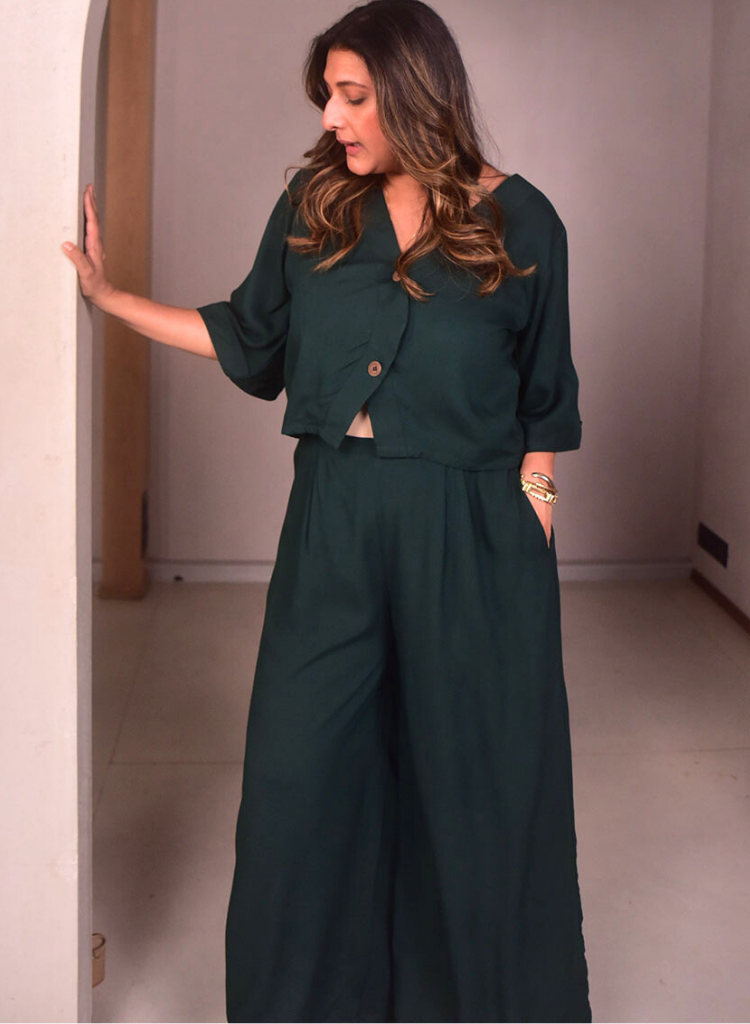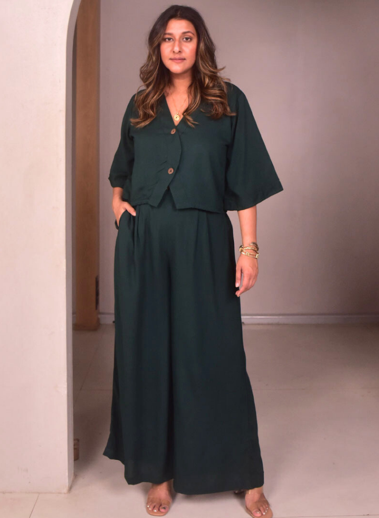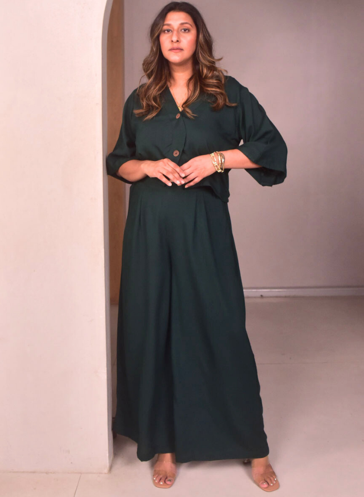 A top featuring flared sleeves, overlapping placket in the front complete with buttons. Length 19". The model is 5'6" and is wearing size M.