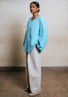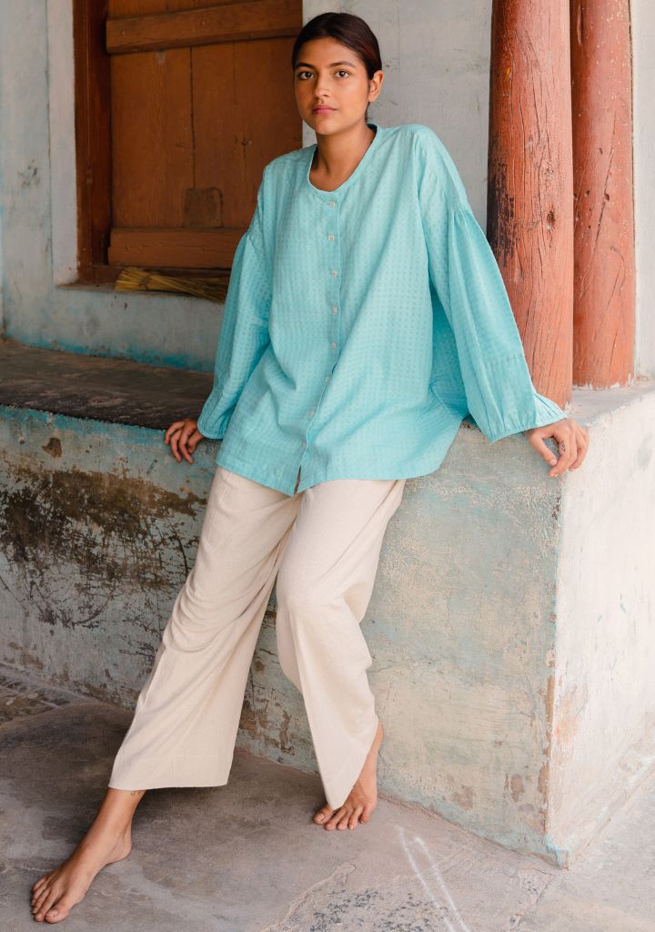 A two-piece set pairing the Vanam Shirt and the Tambi Pants. The oversized checkered shirt with voluminous balloon sleeves and gathered yoke details features a front button closure. Length 25". Made in handwoven cotton. The solid curved pants feature a drawstring on the waist. Length 39". Made in handwoven Twill cotton.