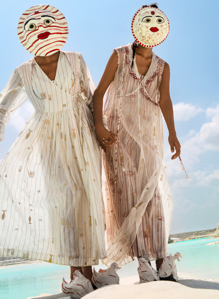 An overlay with overlapping panels featuring a hand-embroidered shawl collar and front tie-ups finished with handmade beaded tassels. Length 55". The model is 5'8" and is wearing a size M.