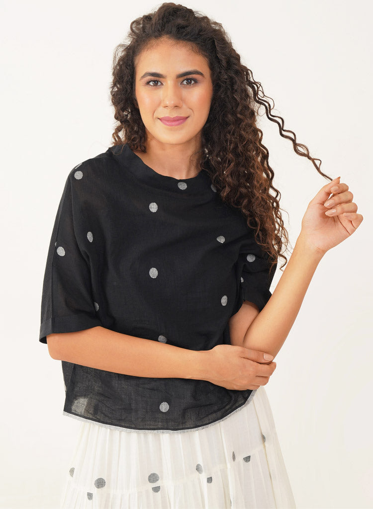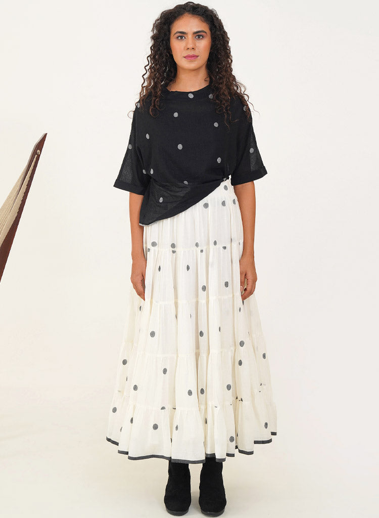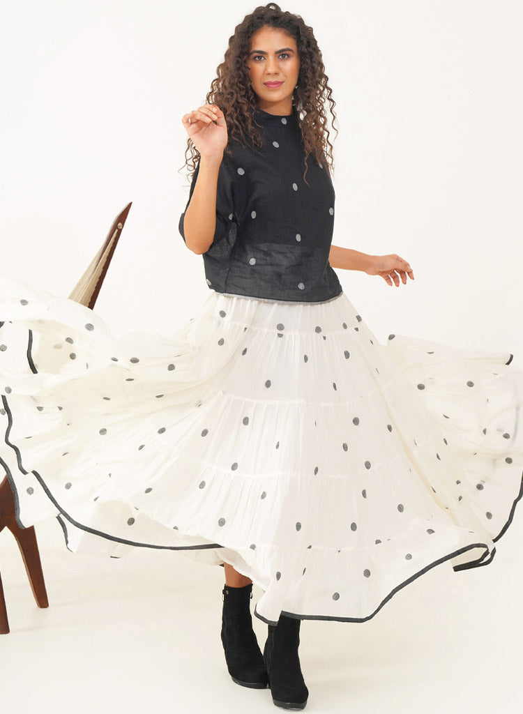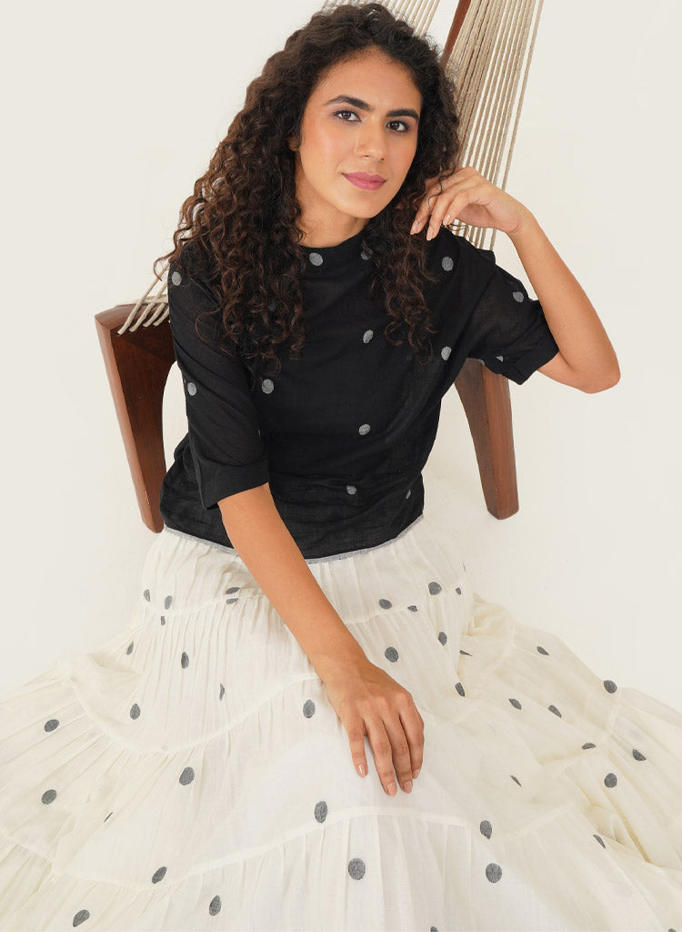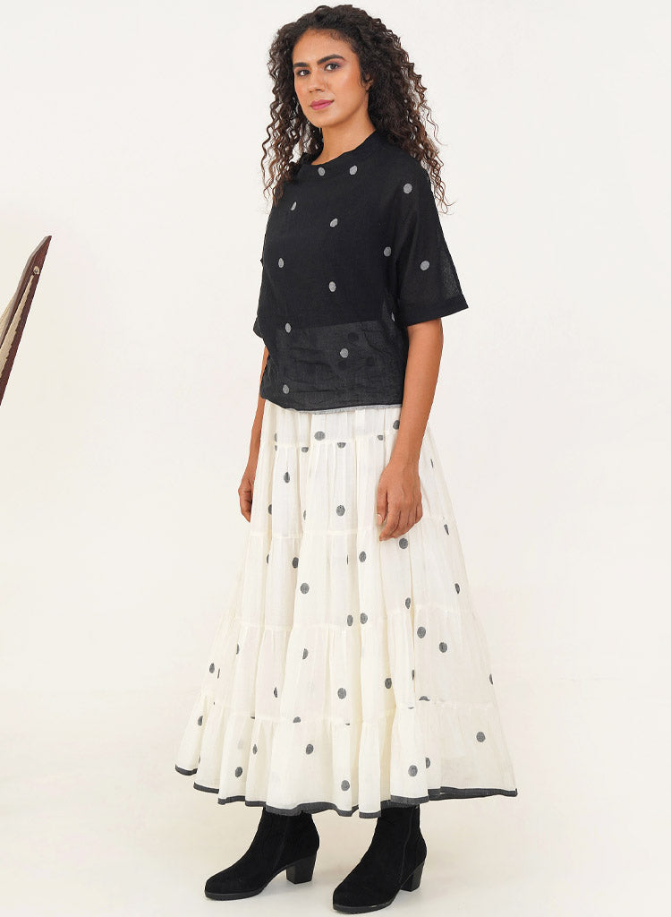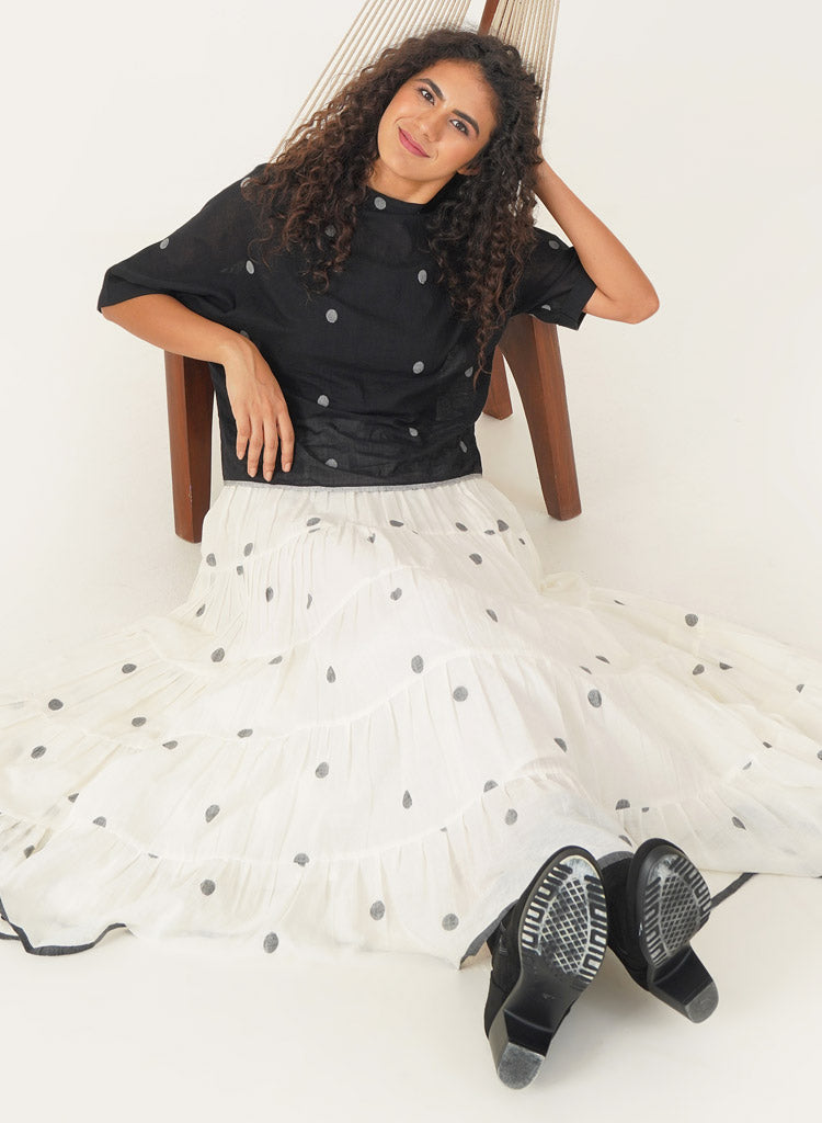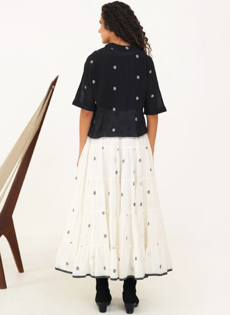 A two-piece set pairing the Palm Top and the Ivanna Skirt. The Jamdani boxy top features a wide polo neck and elegantly folded sleeves. The statement skirt showcases a voluminous tiered silhouette that adds dramatic flair to any outfit. The side zipper fastening ensures a streamlined fit, while the convenient side pockets offer practicality and ease. Length 38"-39". Lined. The model is 5'8" and is wearing size S.