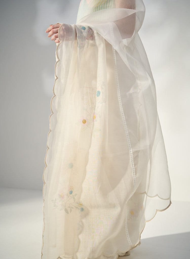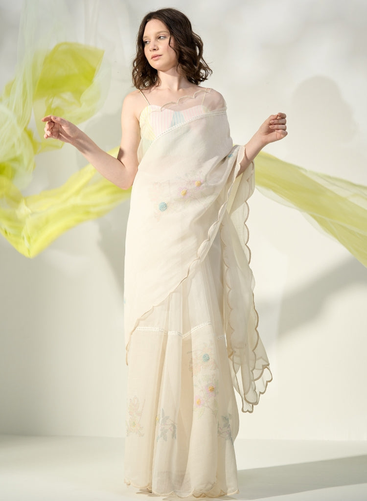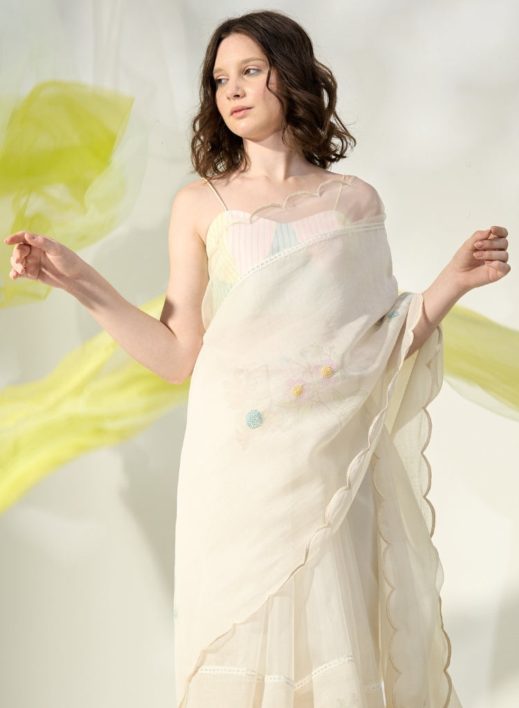 A two-piece set pairing the Anise Saree and the Anise Bustier. The hand block printed saree features hand-embroidered details and a scalloped hem. Length 5.8 meters. Made in organza and Chanderi. The hand-printed striped bustier top features a sweetheart neck and noodle straps. Length 14". Made in cotton, lined.