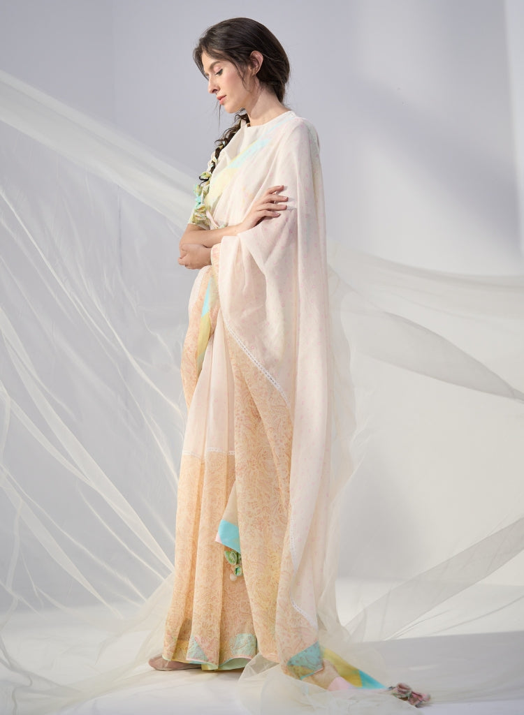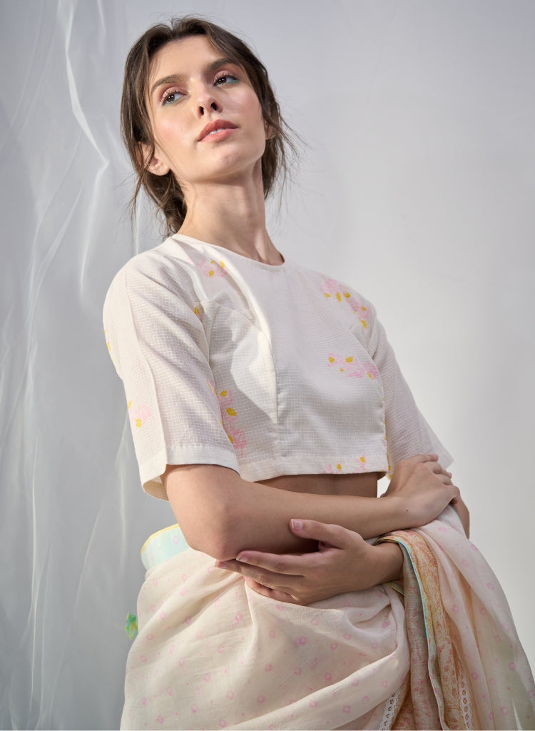 A two-piece set pairing the Butterscotch Saree and the Pearl Blouse. The hand block printed saree features hand embroidered details and tassel detail. Length 5.8 meters. The hand block printed floral saree blouse features a closed round neck. Length 15". Made in cotton, lined.