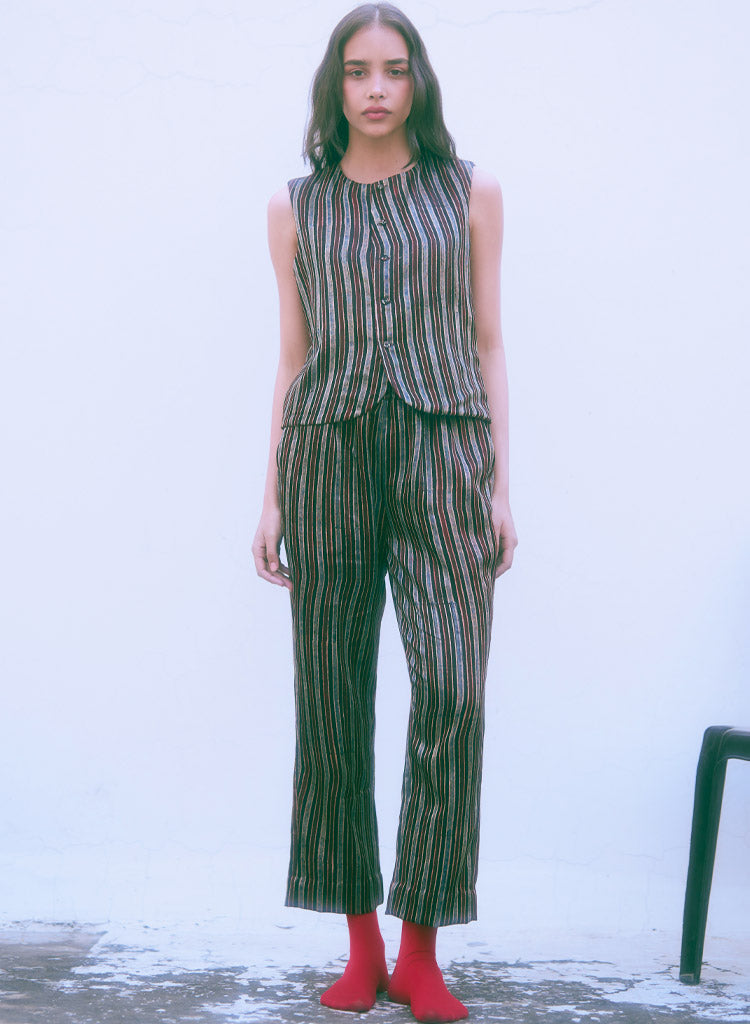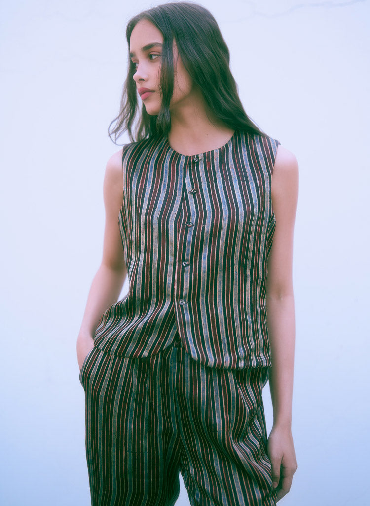 A reversible sleeveless vest top featuring a round neck and a front button placket. Length 20". The model is 5'9" and is wearing a size S.