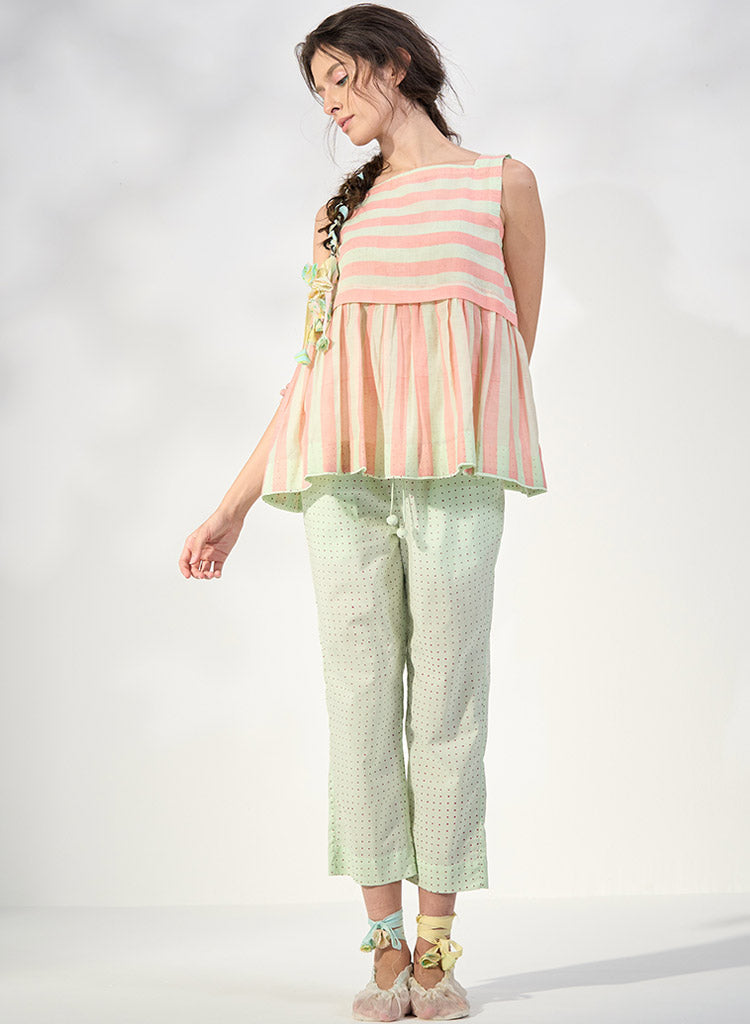 A pair of hand-block printed pants featuring an elasticated drawstring waist and inseam pockets. Length 35". The model is 5'9" and is wearing a size S.