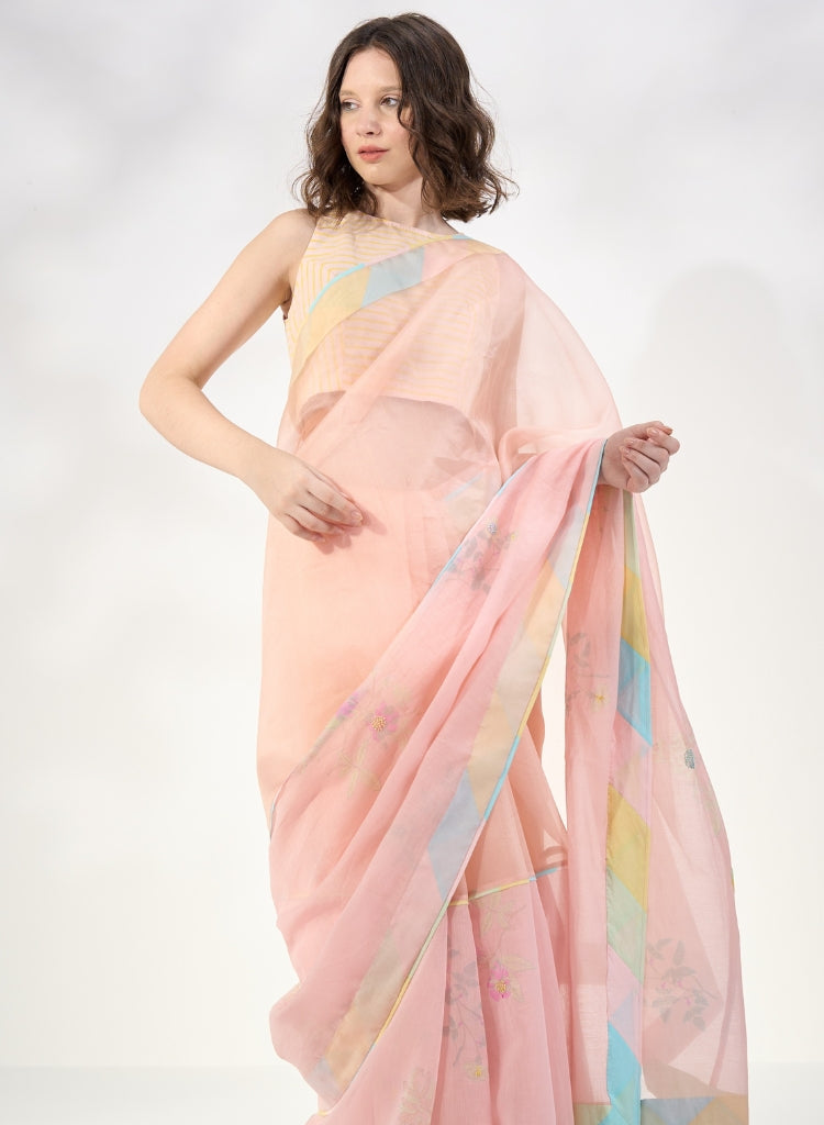 A hand block printed saree blouse featuring a halter neck. Length 15". The model is 5'9" and is wearing a size S.