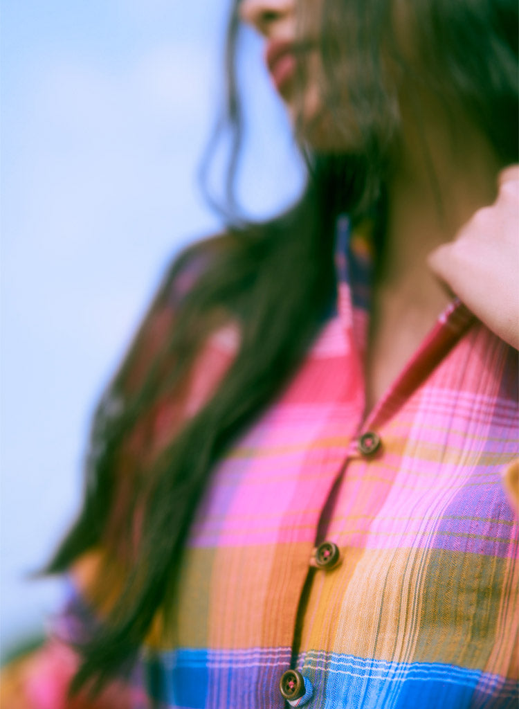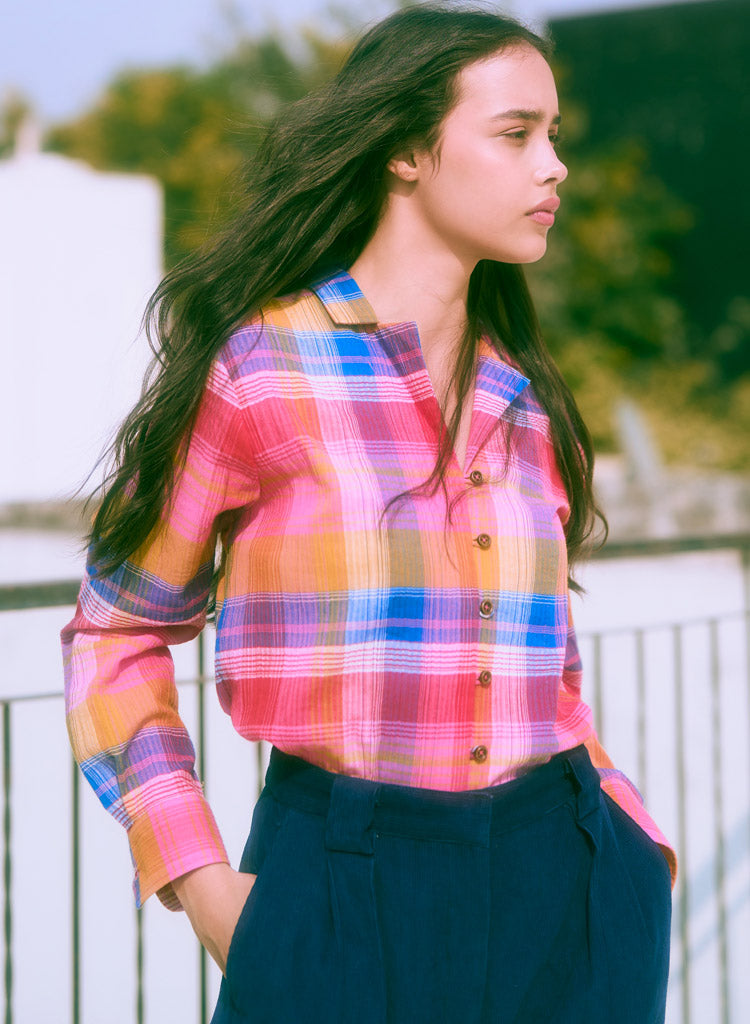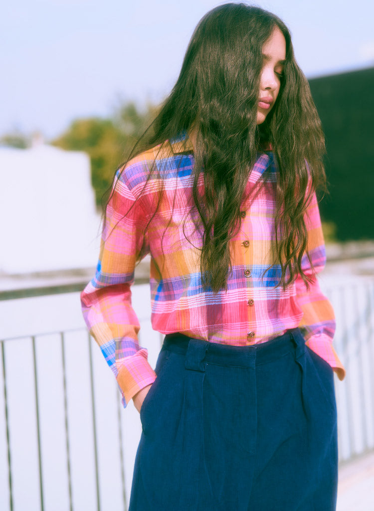 A two-piece set pairing the Tony Shirt and the Carrot Pants. The relaxed fitting checkered shirt features a lapel collar and rouleau button opening. Front length 26", Back length 28". Made in 100% cotton. The baggy fitting pants feature a fixed waist, a zipper button closure, belt hoops and inseam pockets. Length 36". Made in cotton corduroy.