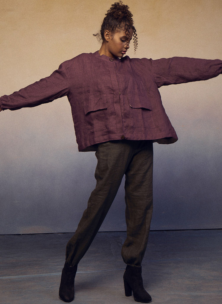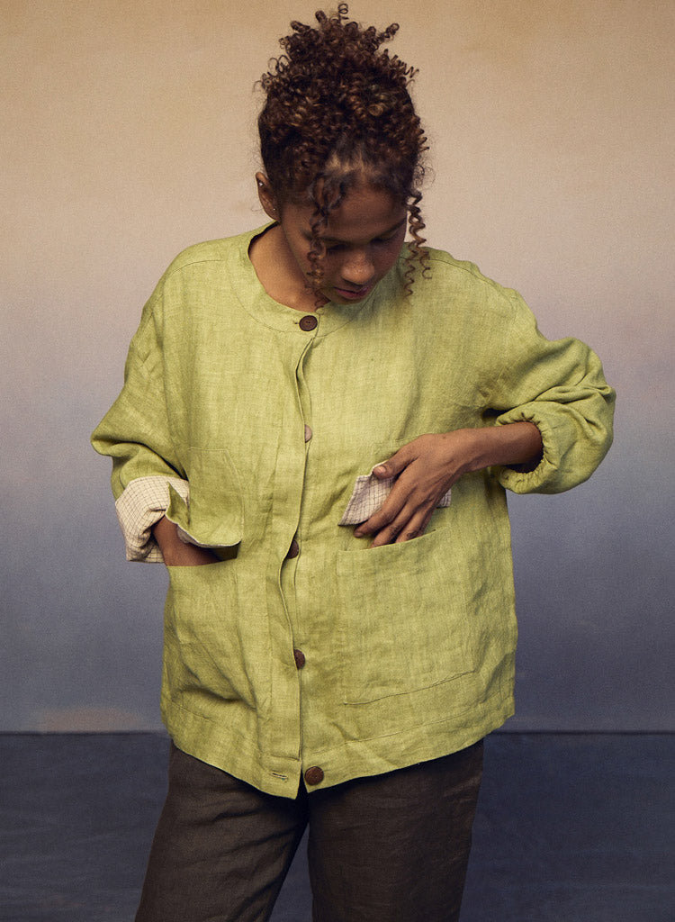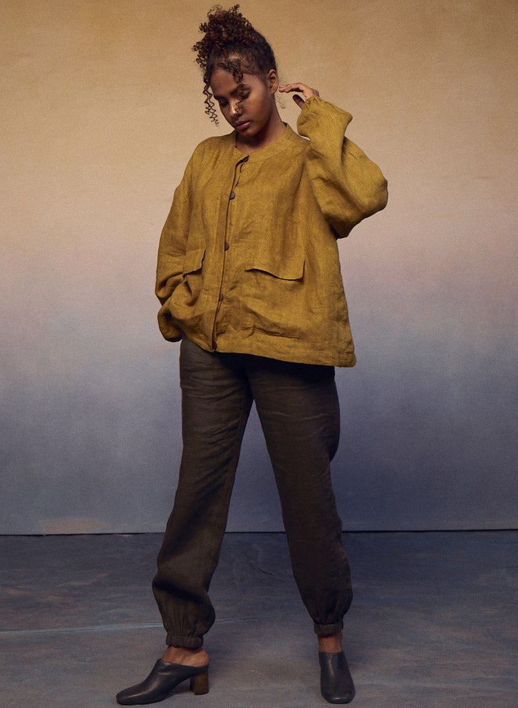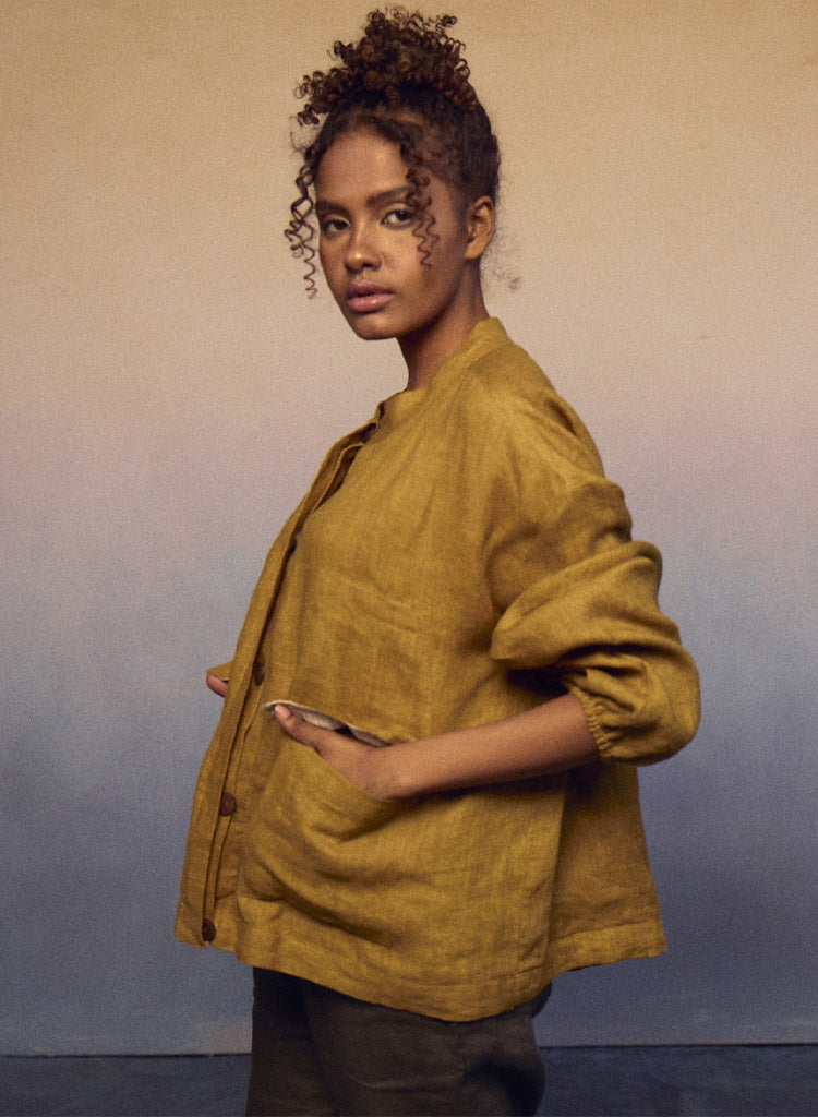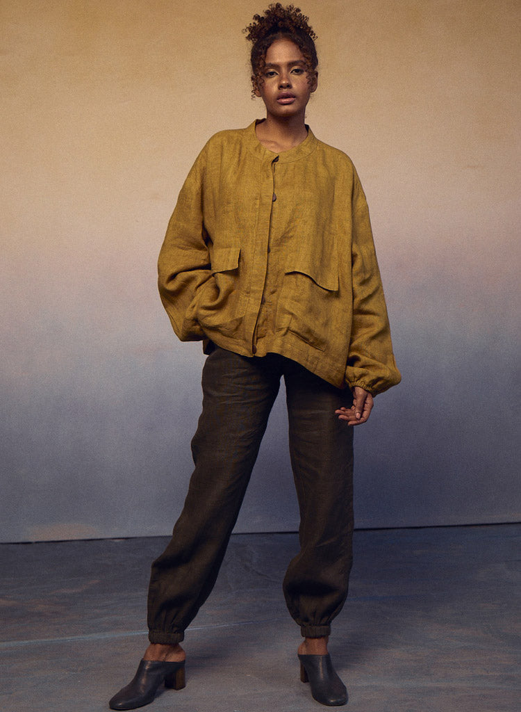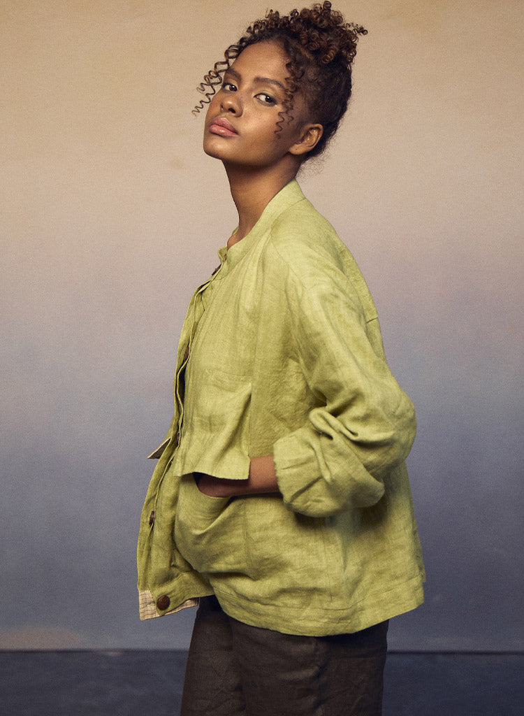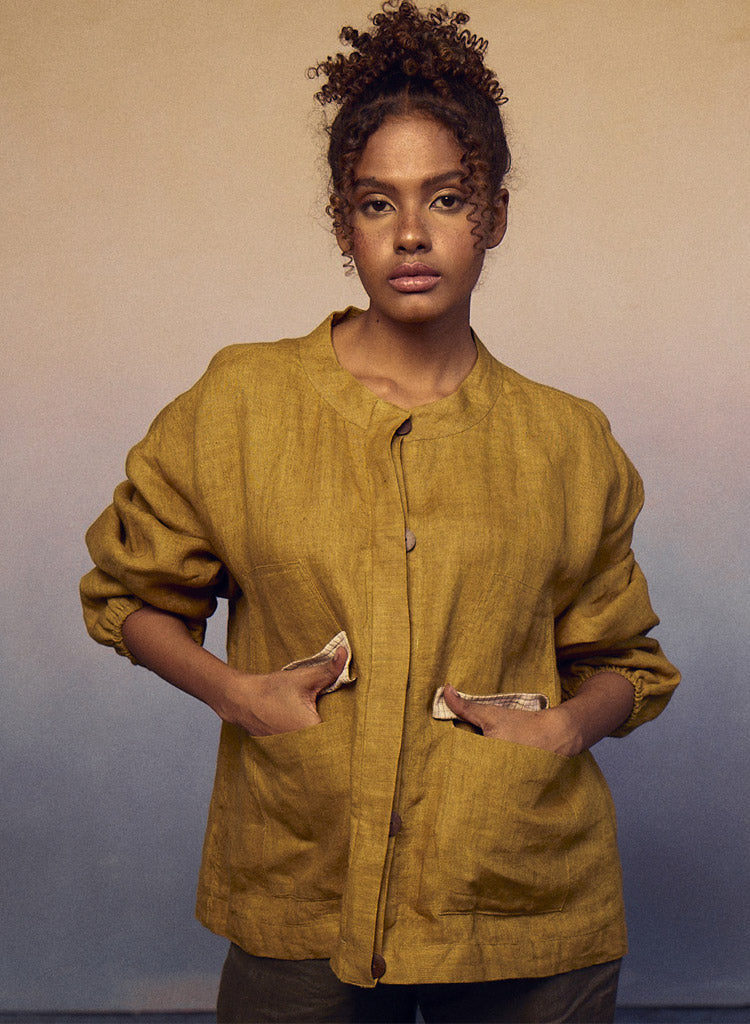 Crafted for both style and function, this piece effortlessly combines the classic appeal of a flat-collar button-down shirt with the practicality of a jacket. Pockets on the waist add a touch of convenience, while the elastic on the sleeves ensures a comfortable fit. Length 23". The model is 5'8" and is wearing a size S.