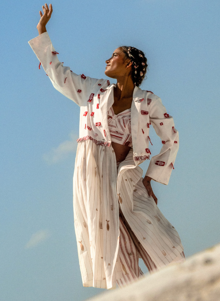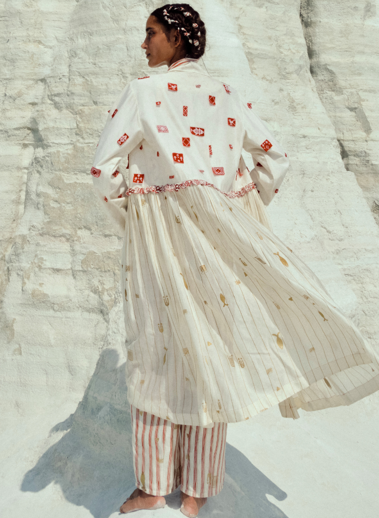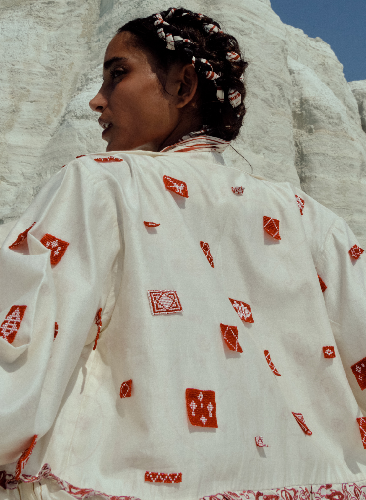 A jacket with intricate hand-made beaded patches featuring a notched lapel collar, hand beaded patches and gathers at the waist. Length 48". The model is 5'8" and is wearing a size M.