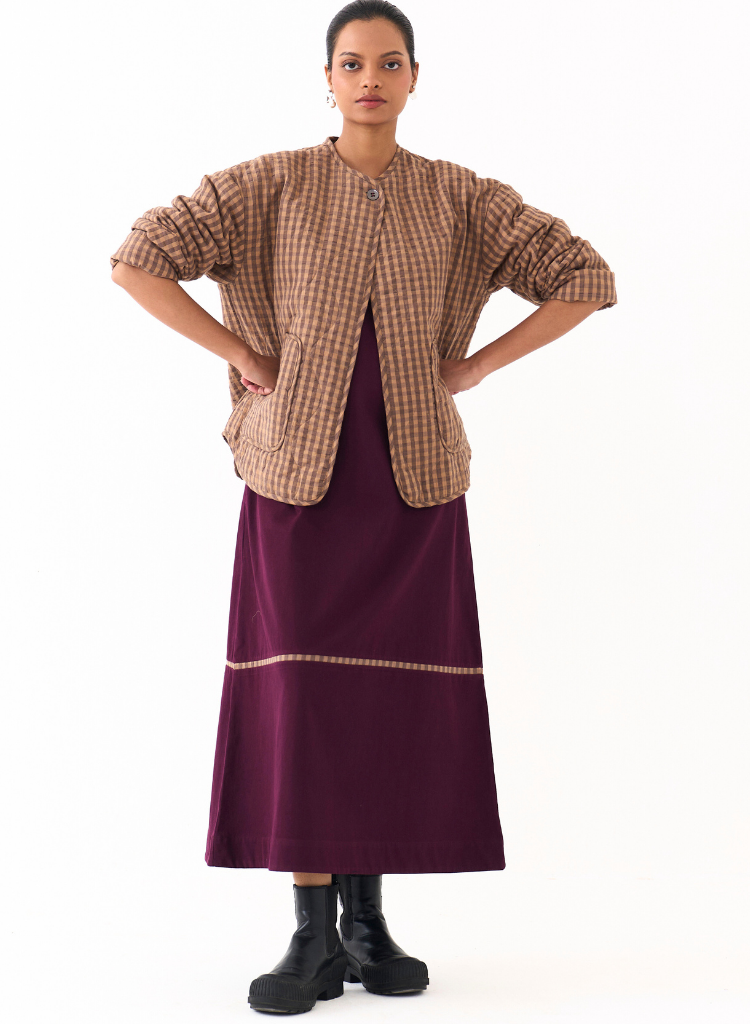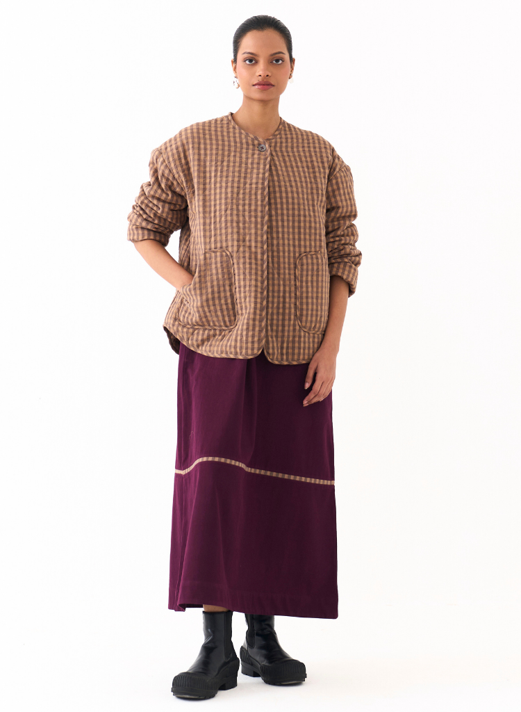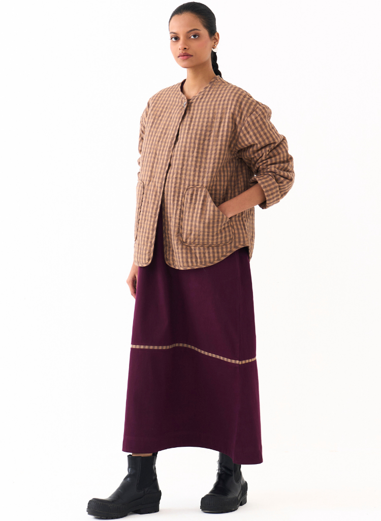 A checkered quilted jacket with a U hem featuring a round neck and front pockets. Length 25". The model is 5'7" & is wearing size S.