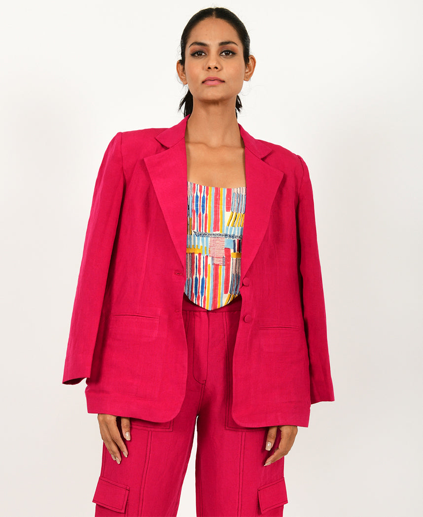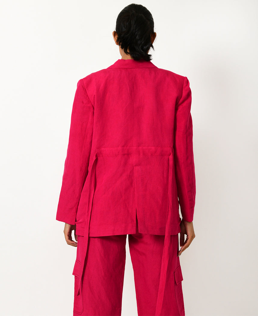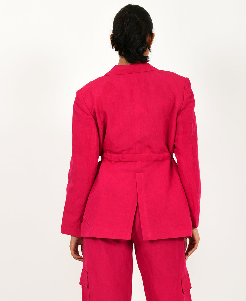 A double-breasted jacket featuring a lapel collar, flap pockets, and a back slit. Length 25".
