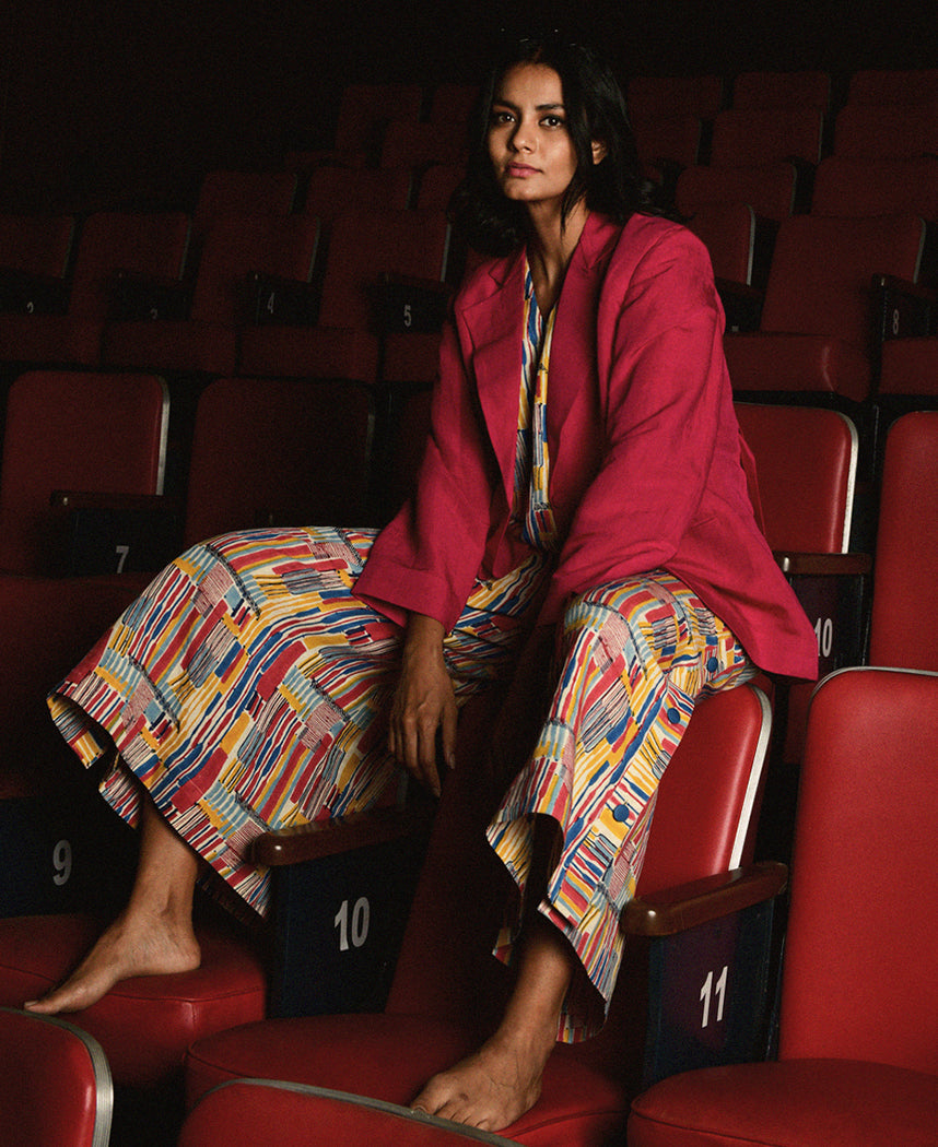 Made in linen. Comes with a fabric belt. The model is 5'9" and wears a size XS.