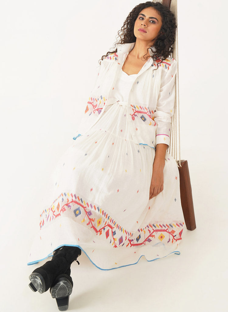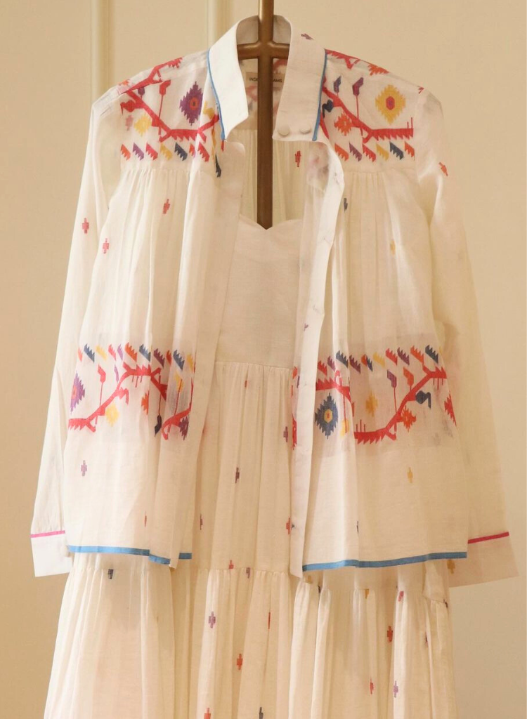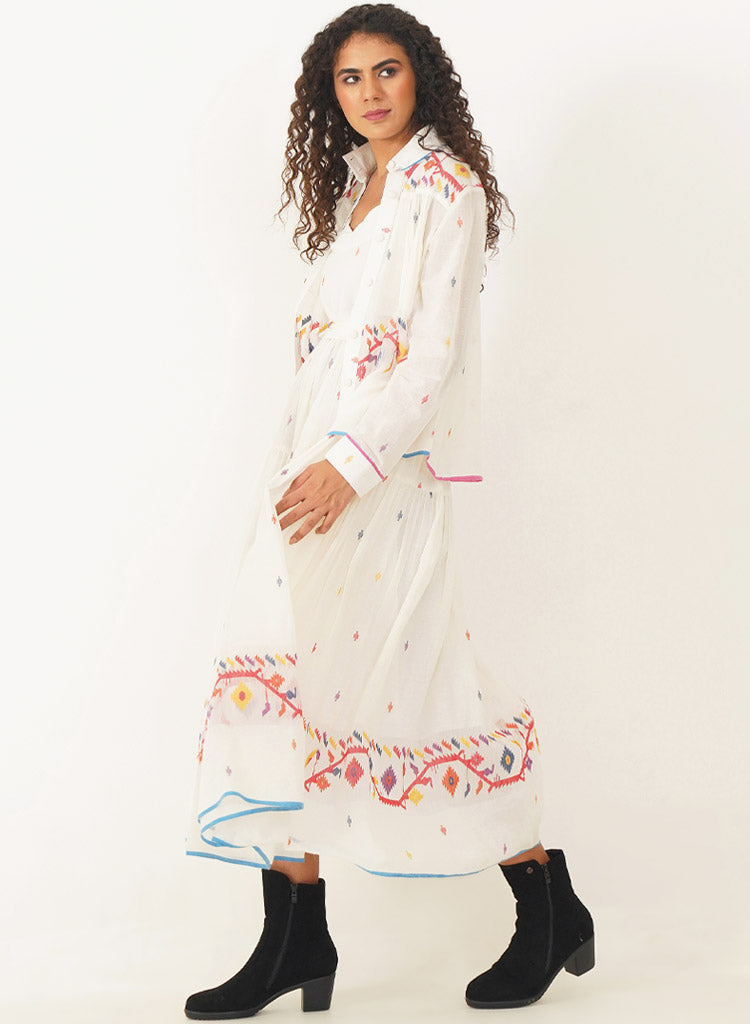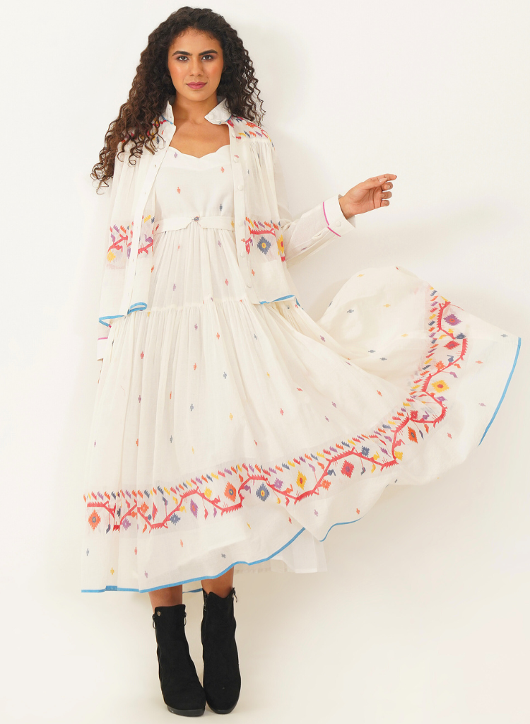 A two-piece set pairing the Kora Dress and the Kora Top. The elegant Jamdani dress beautifully combines classic charm with contemporary design. The dress features a delicate scallop neckline with soft gathers that cascade gracefully, enhanced by a sleek back zipper fastening for a refined fit and practical side pockets. Comes with a matching Jamdani belt that adds the perfect finishing touch. Length 53". The handwoven button-down top is designed to double as a sophisticated overlay. The high collar and cuffed sleeves add a touch of refined elegance, while gentle gathers at both the front and back provide fluidity and ease of movement. Length 24". The model is 5'8" and is wearing size S.