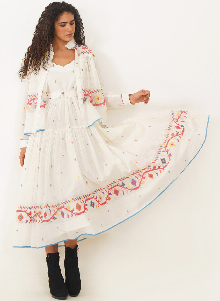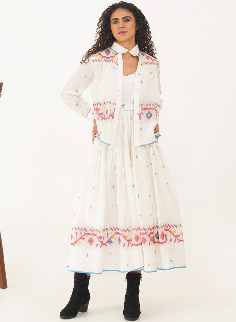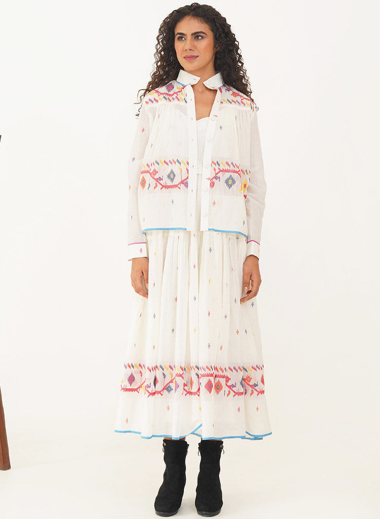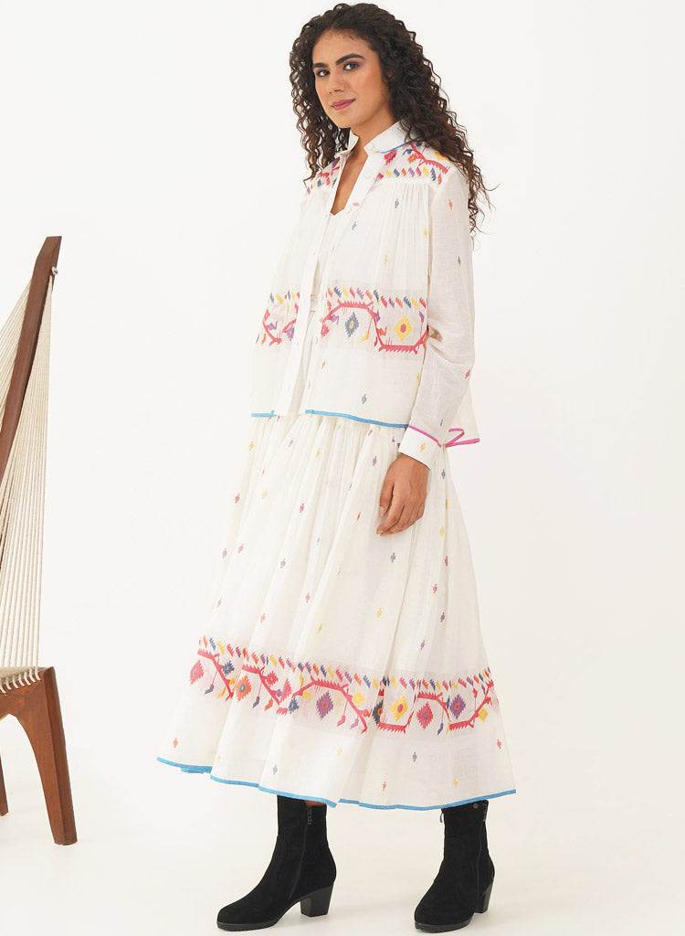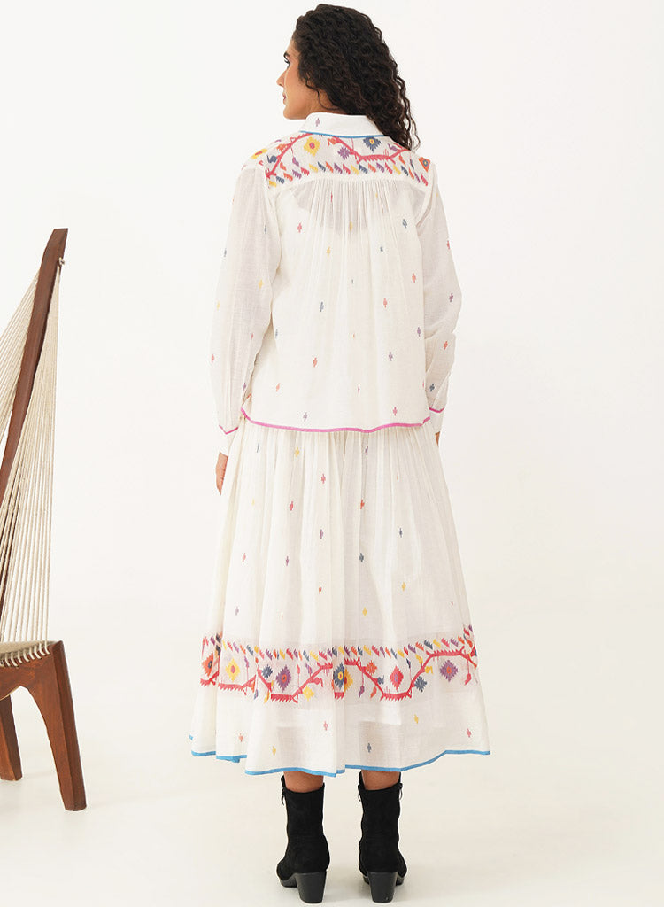 A two-piece set pairing the Kora Dress and the Kora Top. The elegant Jamdani dress beautifully combines classic charm with contemporary design. The dress features a delicate scallop neckline with soft gathers that cascade gracefully, enhanced by a sleek back zipper fastening for a refined fit and practical side pockets. Comes with a matching Jamdani belt that adds the perfect finishing touch. Length 53". The handwoven button-down top is designed to double as a sophisticated overlay. The high collar and cuffed sleeves add a touch of refined elegance, while gentle gathers at both the front and back provide fluidity and ease of movement. Length 24". The model is 5'8" and is wearing size S.
