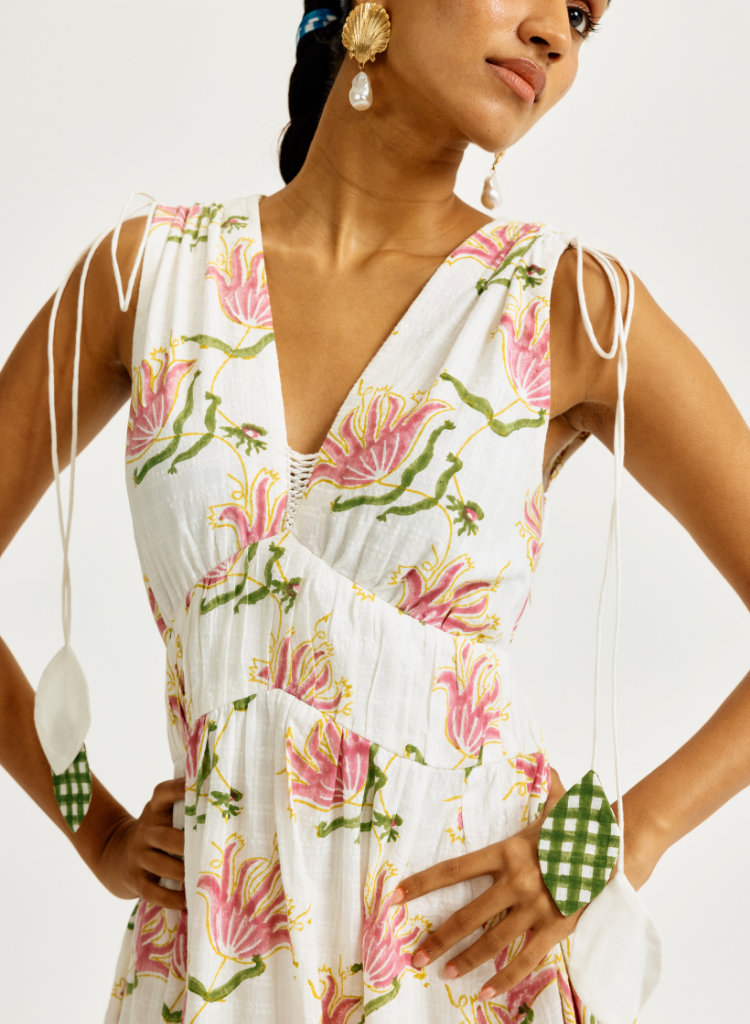 The Moor Dress showcases a block-printed pink floral motifs. This sleeveless silhouette is detailed with delicate shoulder ties that you can adjust for the perfect fit. The softly gathered empire waist flatters the body, flowing into a full, ankle-grazing skirt. Length 50". The model is 5'6" and is wearing a size XS.