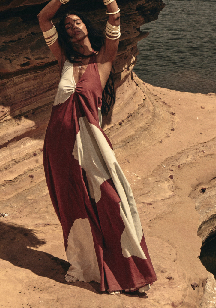 An halter-neck jumpsuit featuring an abstract floral print gathered gently at the neckline for movement and ease. The model is 5'9" and is wearing a size S.