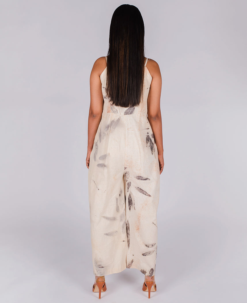 A wide leg eco printed jumpsuit with flat noodle straps. Features a V-neck and a concealed side zipper. Length 47". The model is 5'3" and wearing size M.