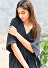 An oversized kaftan midi dress with a V-neck and side pocket features relaxed 3/4 sleeves and a small slit at the hem. Length 47". The model is 5'6" and is wearing size XS.