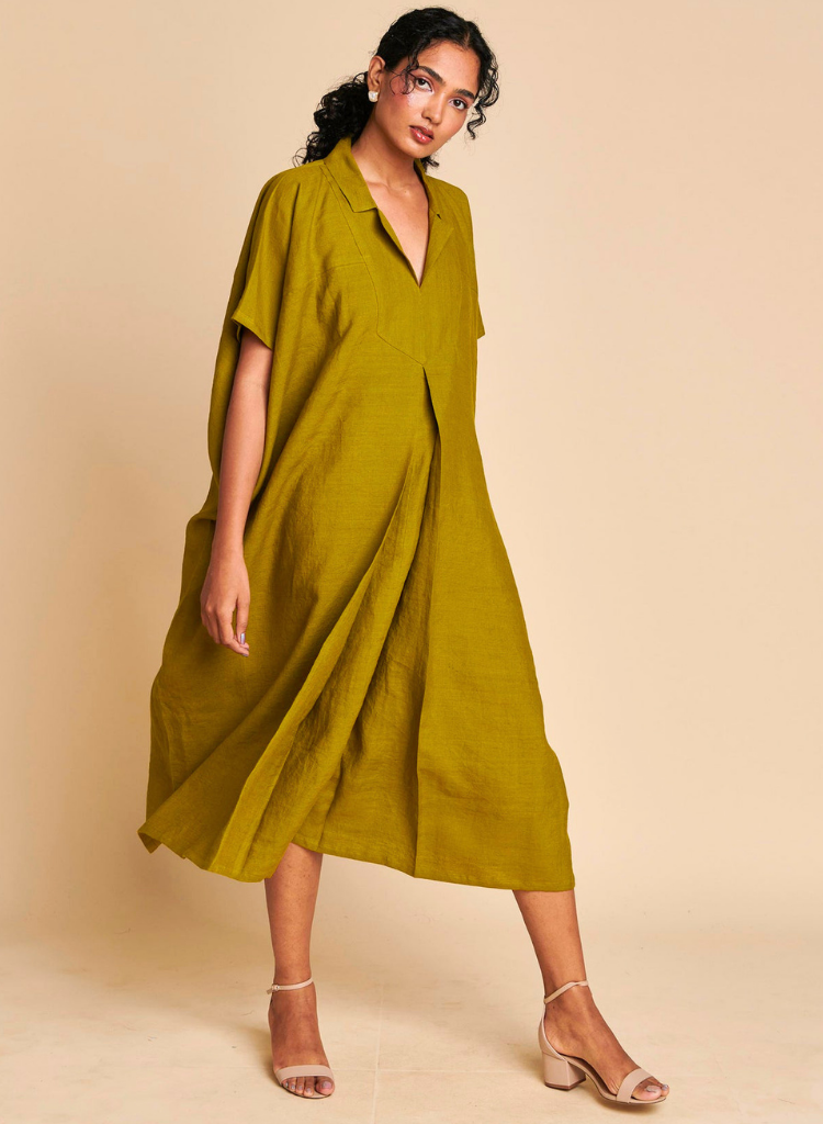 A kaftan dress featuring a V-neck and an inverted pleat detail. The model is 5'8" and is wearing size S.