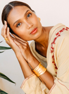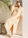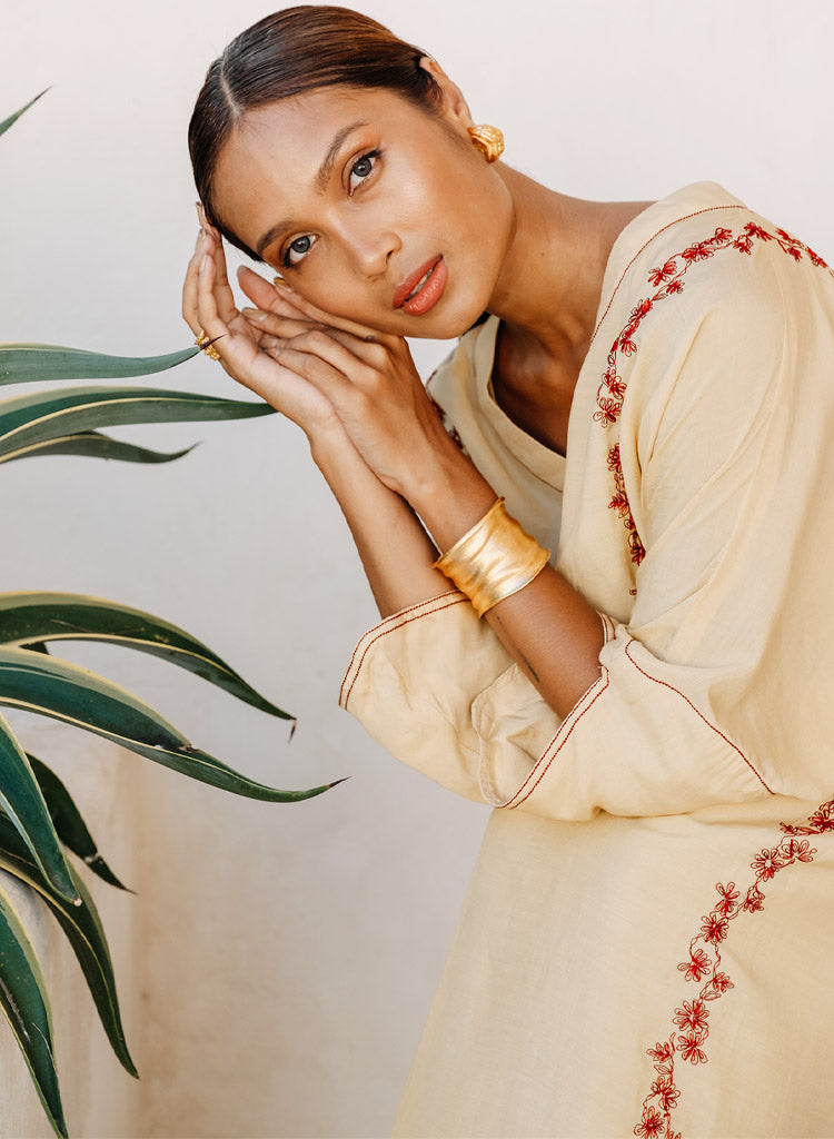 A relaxed fitting kaftan dress detailed with hand embroidery and stitching detail with contrast thread on the seam lines. Features a V-neck, inseam pockets and side slits. Comes with a cotton slip. Length 51". The model is 5'8", and is wearing size S.