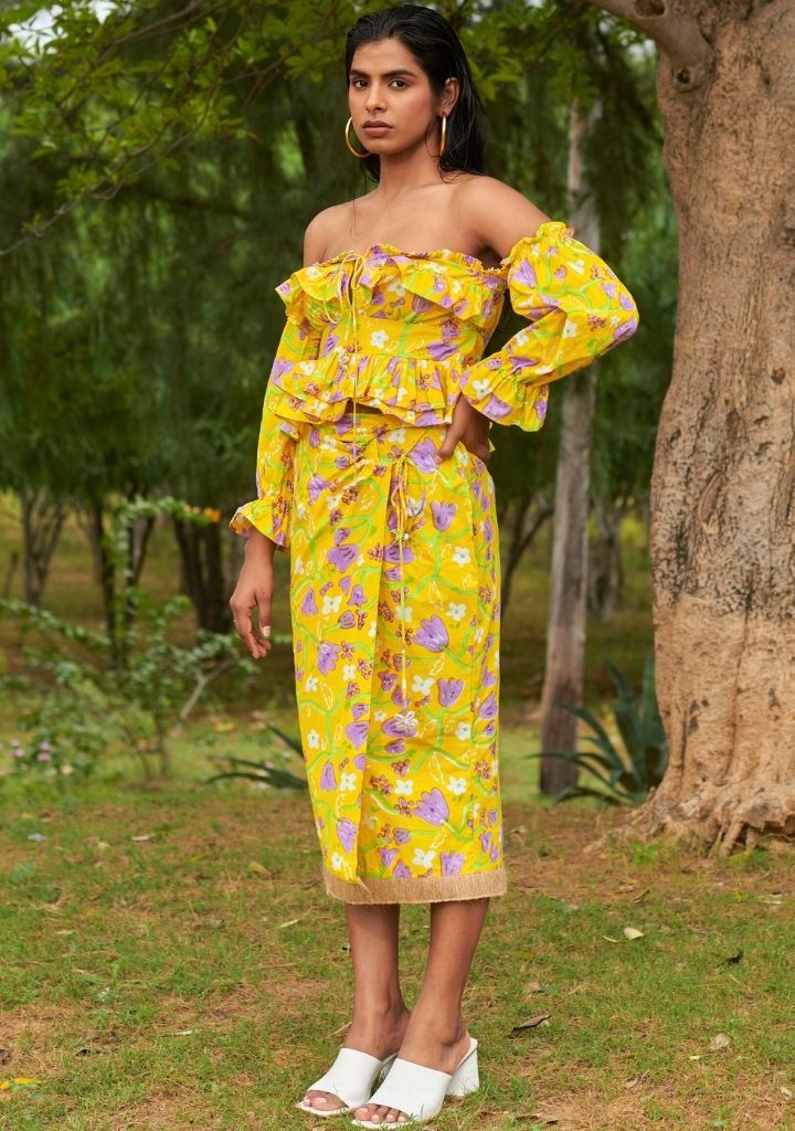 A two-piece set pairing the Hawaiin Off Shoulder Top and the Hawaiian Wrap Tie Skirt. The printed off-shoulder crop top with frills and ruffles all over and a front tie-up with shells at the end features off-shoulder long sleeves and concealed back zipper closure. Length 13”. The printed straight midi wrap skirt with a jute hem features adjustable tie-ups at the side with shells at its end. Length 30”. The model is 6ft and is wearing a size XS.